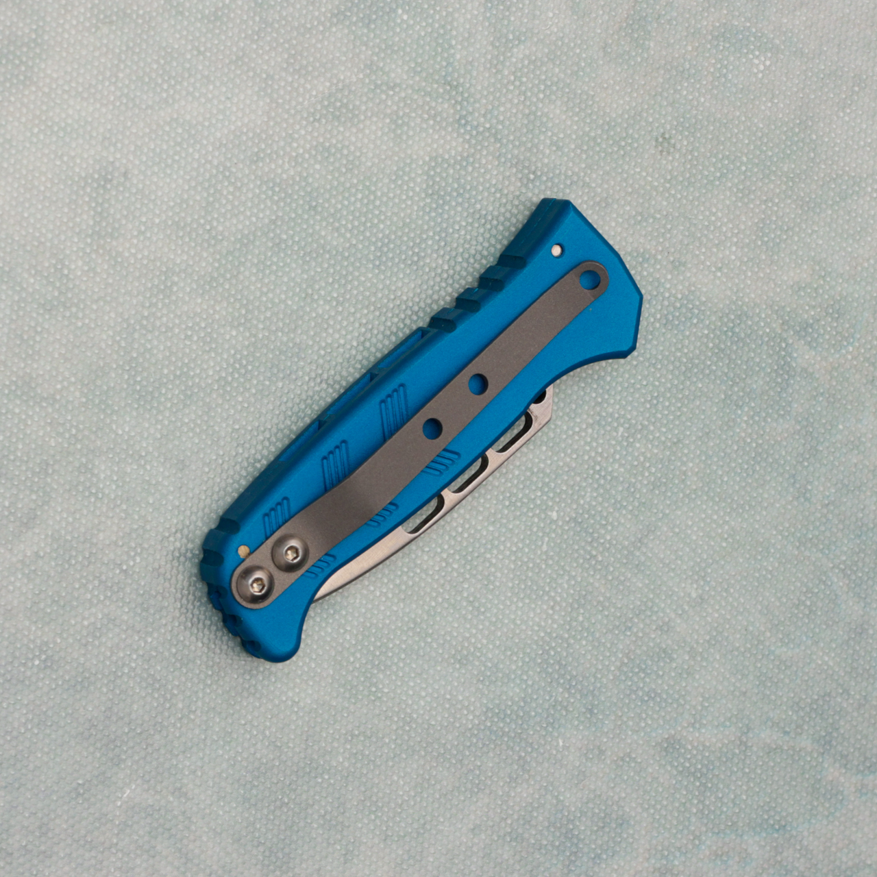 Dalton CS Militia side opener auto, has blue aluminum scales and a satin vented blade with biker babe engraved in it. In great shape from a collector.