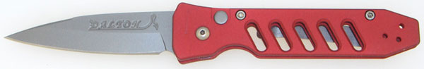 Red anodized and skeletonized aluminum handle has 5 machined slots on each side. Reversible pocket clip mounted for tip-up carry. Lanyard Hole. Bead blasted ATS-34 swedged modified clip point blade stamped DALTON - DEVILS-TALON. This knife offers the standard, hard-hitting push button automatic action, specific to all Dalton knives. A perfect sized knife that is nice and slim for easy carry.