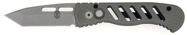 Lightweight gray skeletonized anodized T-6 aluminum handle scales with jimping for better grip and control. Bead blasted ATS-34 stainless steel tanto blade with a chisel ground edge. The blade is etched with the Dalton logo and has two cutouts. Removable pocket clip for tip up carry. Hard hitting action and a chisel ground blade. One of my favorite Dalton knives ever made!