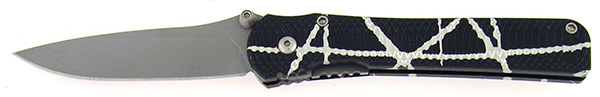 Machine textured black & silver splash anodized 6061-T6 aircraft aluminum handle scales. Bead blasted ATS-34 stainless steel blade stamped DALTON. Nice big thumb stud and jimped liner lock for easy operation. Removable skeltonized titanium pocket clip stamped DC USA. A well built liner lock pocket knife! Made in October of 2004.