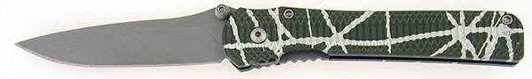 Machine textured green & silver splash anodized 6061-T6 aircraft aluminum handle scales. Bead blasted ATS-34 stainless steel blade stamped DALTON. Nice big thumb stud and jimped liner lock for easy operation. Removable skeltonized titanium pocket clip stamped DC USA. A well built liner lock pocket knife! Made in October of 2004.