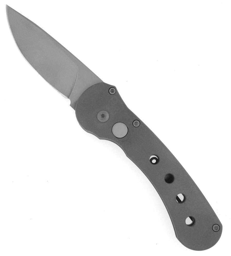 Awesome bead blasted titanium handle scales with 4 machined holes. The front scale is engraved with a skull and 05. Bead blasted ATS-34 stainless steel chisel ground drop point blade, the back side is engraved DALTON MACHINE GUN SHOOT 05 with a picture of a machine gun. Hard hitting action. Bead blasted titanium pocket clip stamped DC USA. New condition.