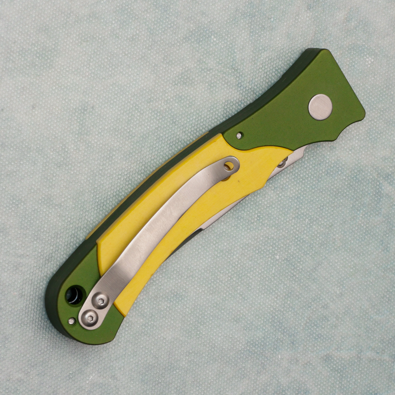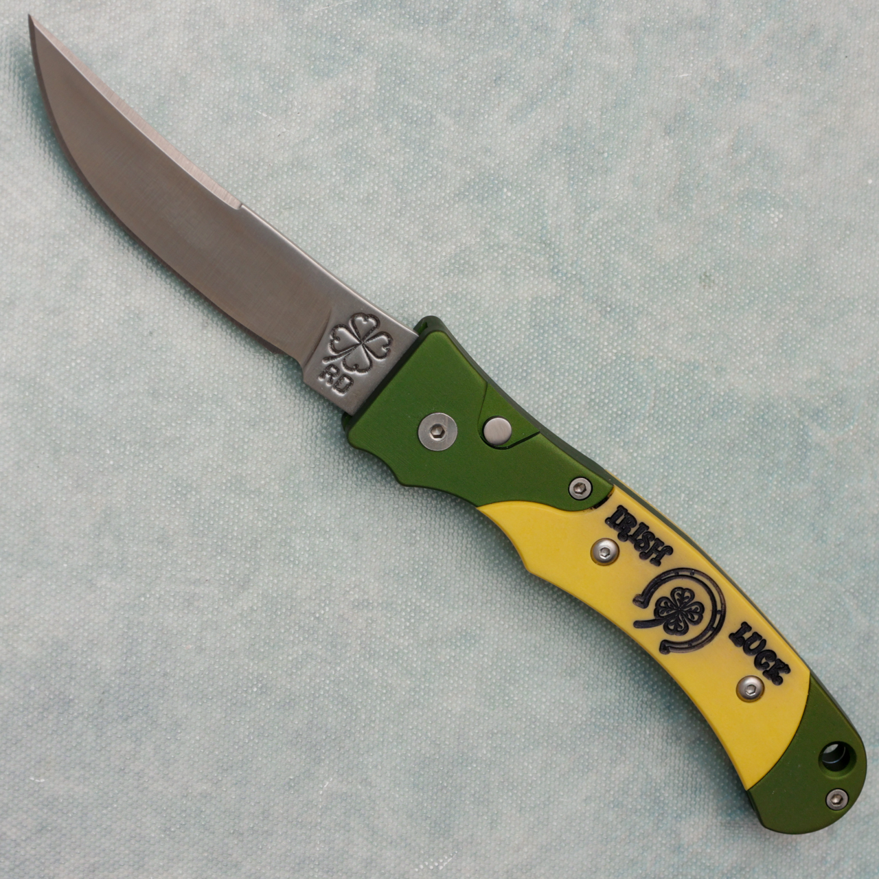 Dalton Small Persian Fight side opener auto, has green aluminum scales with Irish luck inlays, and a satin blade. Knife is in great shape from a collector.