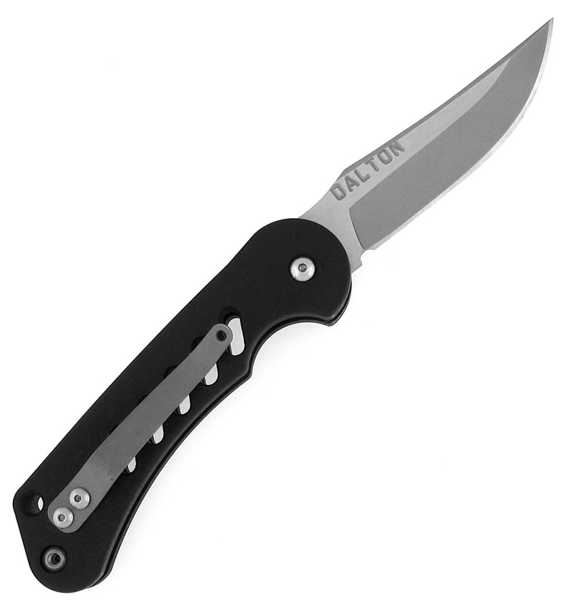 Skeletonized black anodized aluminum handle scales. Two tone bead blasted and satin finished ATS-34 stainless steel clip point blade stamped DALTON. The blade has extremely good action when the scale is slid forward. Bead blasted titanium pocket clip for tip-up carry. Layard hole. Hard to find prototype Dalton automatic pocket knife.