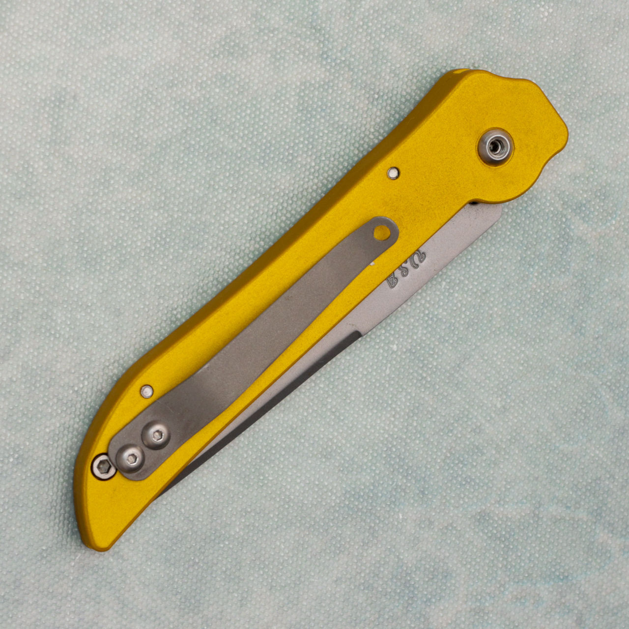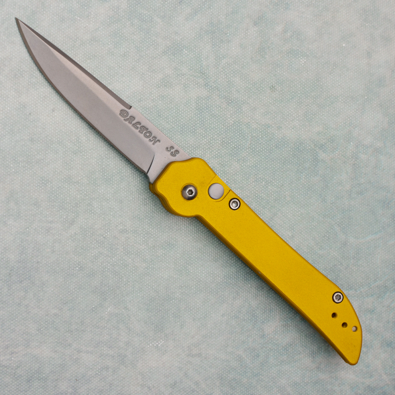 Dalton Super Slim side opener auto, has gold aluminum scales and a bead blast blade. In great shape from a collector.