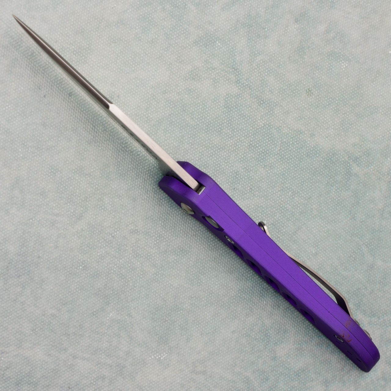 Dalton Super Slim Lite side opener auto, has purple slotted aluminum scales and a satin blade. Has some marks on the spine of handles towards bottom, otherwise in great shape from a collector.