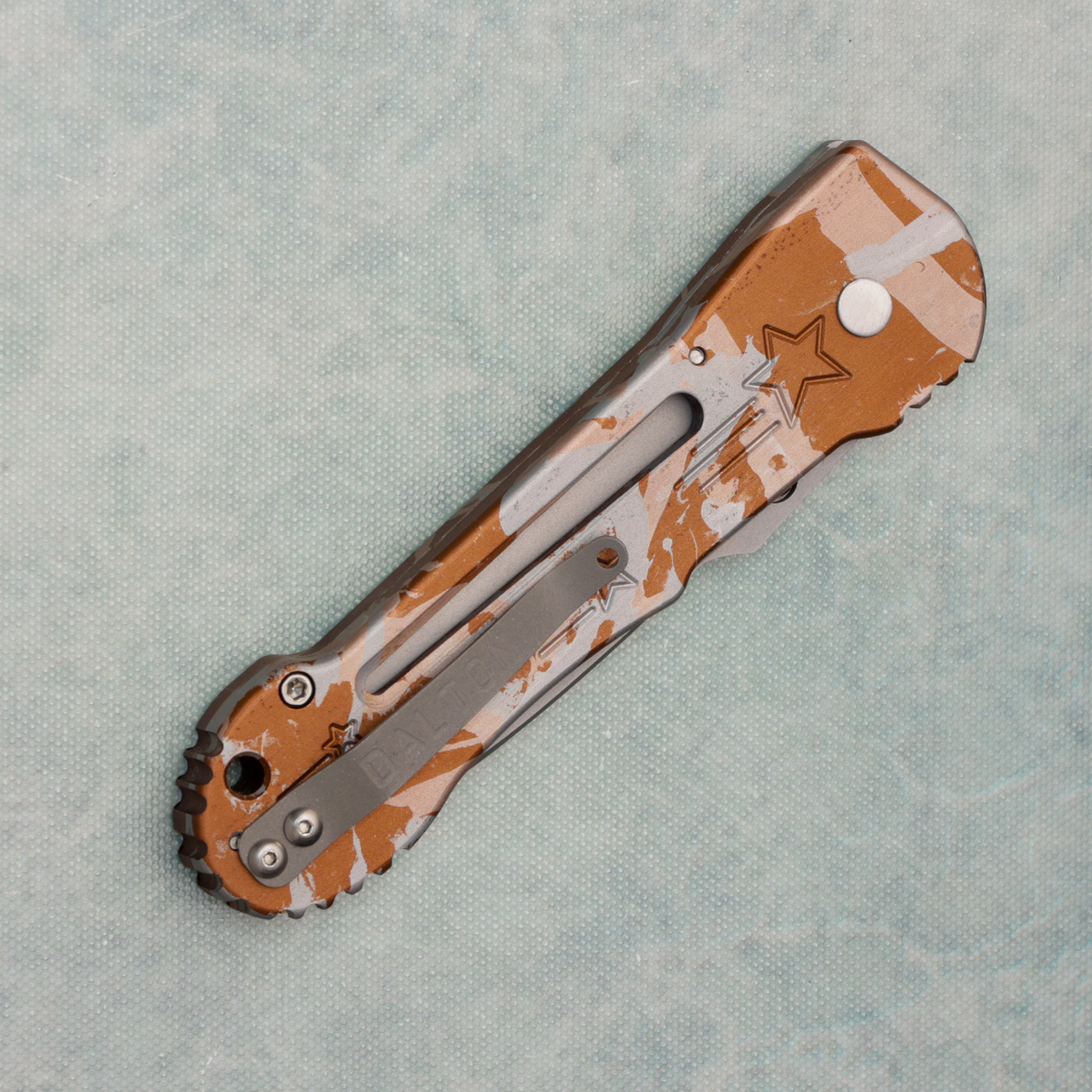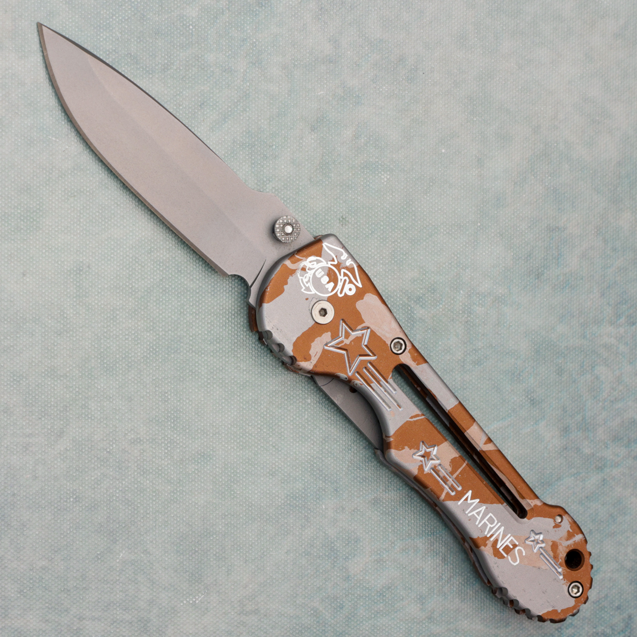 Dalton side opener thumb stud auto, has camo marines aluminum scales and a bead blast blade. Very good condition, from a collector. Opens with a press to the thumb stud and has a liner lock close.