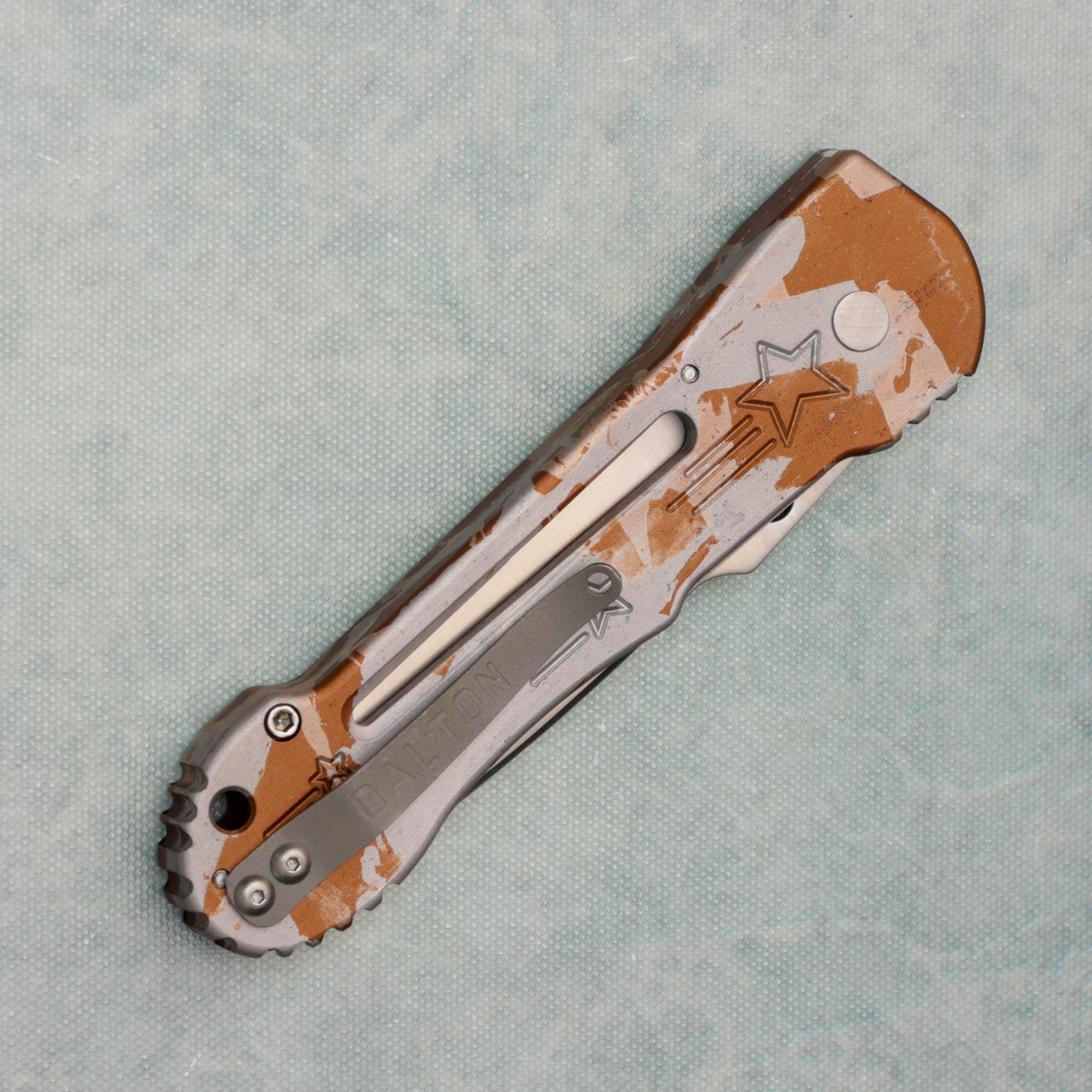 Dalton side opener thumb stud auto, has camo stars aluminum scales and a bead blast blade. Very good condition, from a collector. Opens with a press to the thumb stud and has a liner lock close.