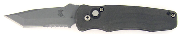 Awesome bead blasted solid titanium handle scales with grooves. Bead blasted ATS-34 stainless steel chisel ground tanto blade with a partially serrated edge. The Dalton logo is etched on the blade. Jimping on the raised thub ramp provides more grip and control. Lanyard hole. Hard hitting automatic action and a chisel ground blade! This knife was made pre 1998.
