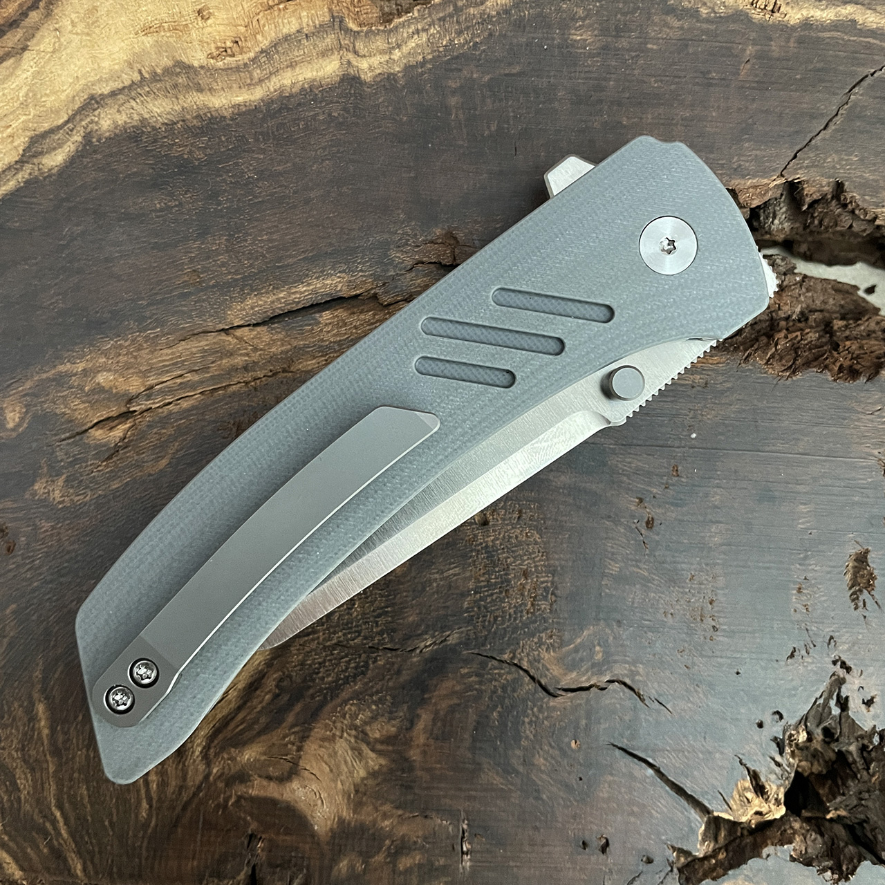Dark Bolt Design Arcus Button Liner Lock Flipper Smooth Gray G-10 Handles Satin 20CV Blade/span>