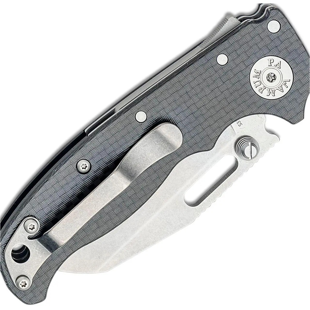 This model features carbon fiber handle scales. Stonewash finished CPM-S35VN stainless steel shark foot style blade. Satin finished hardware and a stonewashed pocket clip. Brand new in box with spare pocket clip.