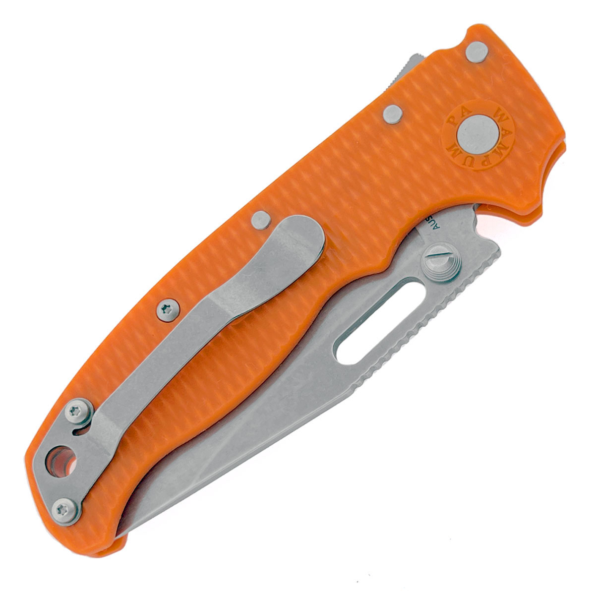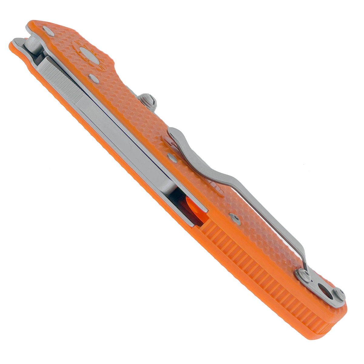 This model features orange grivory handle scales. Stonewash finished AUS10A stainless steel clip point blade. Satin finished hardware and a stonewashed pocket clip. Brand new in box with pouch, polishing cloth, and spare pocket clip.