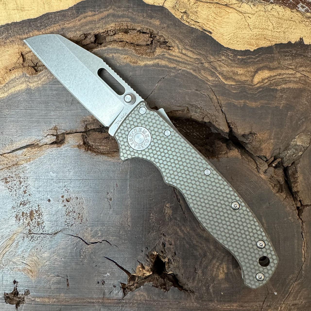 This model features light green anodized hex pattern titanium scales. Stonewash finished CPM-20CV stainless steel shark foot blade. Satin finished hardware and a stonewashed pocket clip. Brand new in box with spare pocket clip.