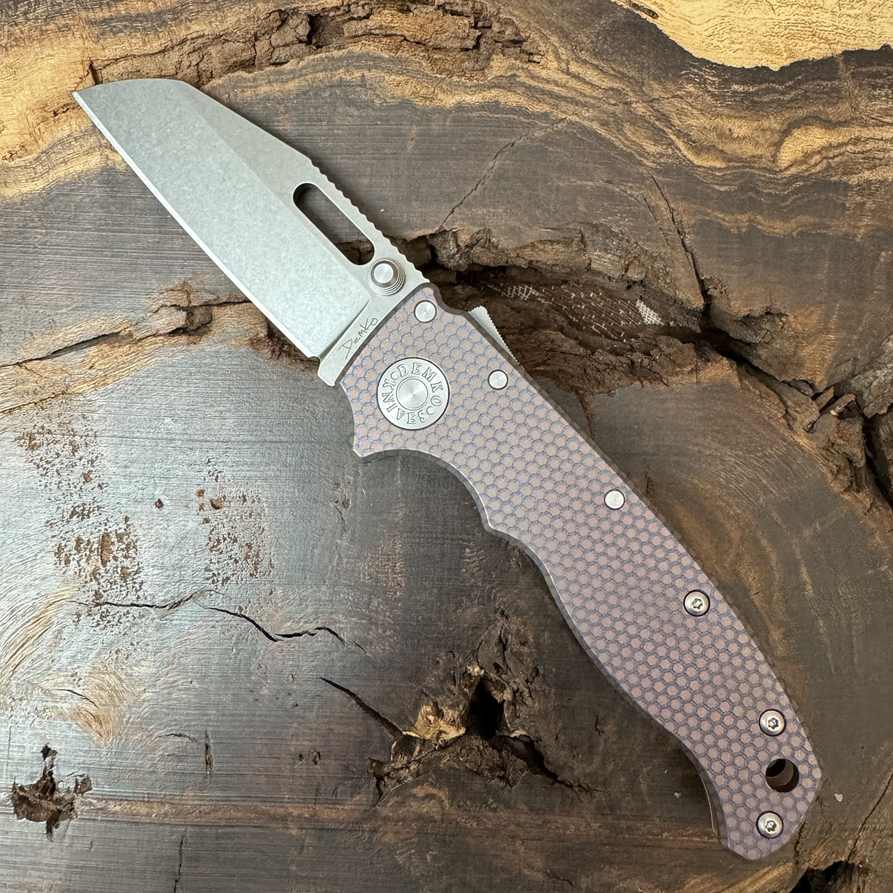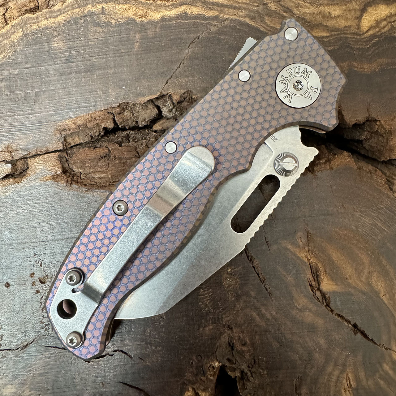 This model features light purple/bronze anodized hex pattern titanium scales. Stonewash finished CPM-20CV stainless steel shark foot blade. Satin finished hardware and a stonewashed pocket clip. Brand new in box with spare pocket clip.