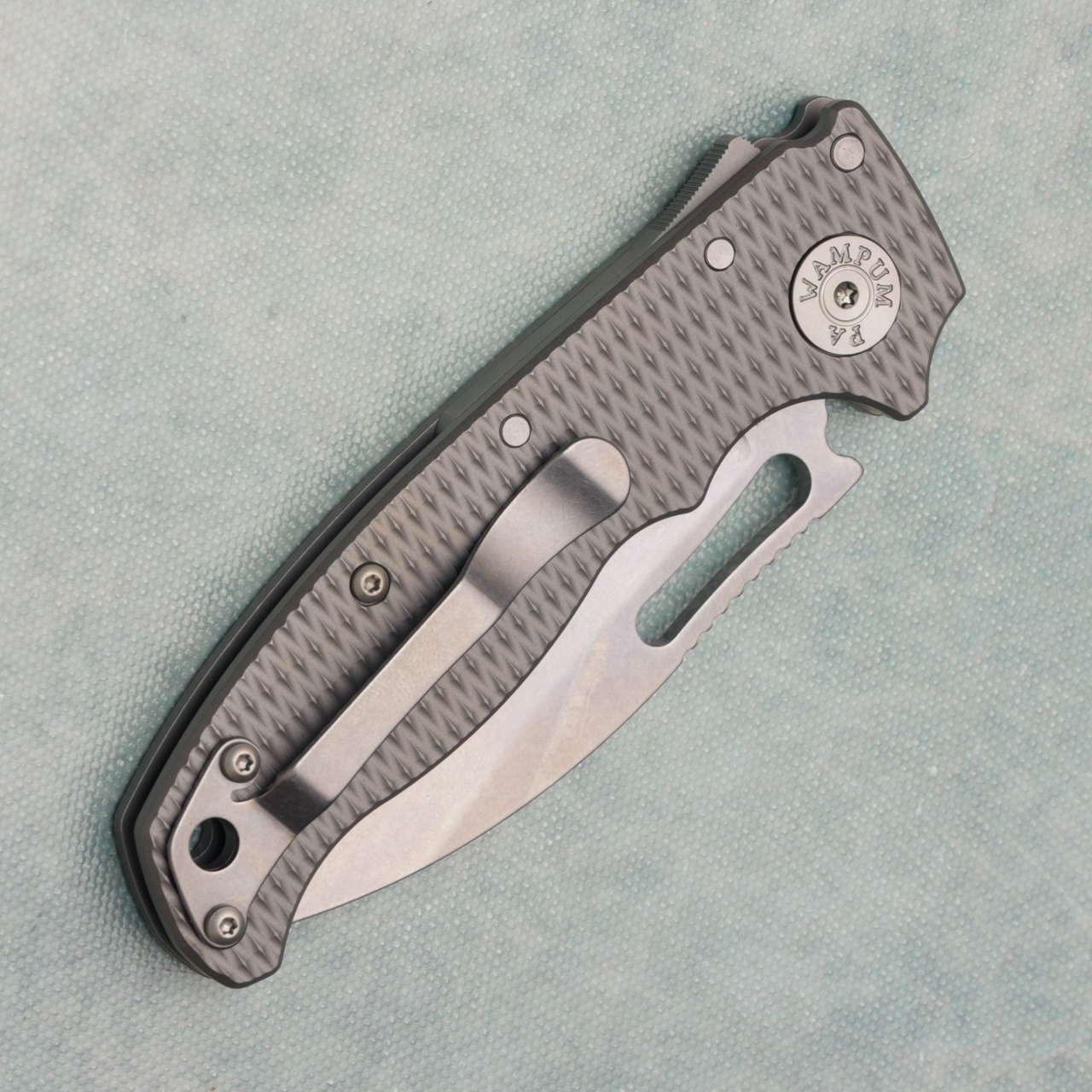 This model features textured titanium scales. Stonewash finished CPM-3V slicer blade. Stonewash finished hardware and pocket clip. Brand new in box with spare pocket clip.