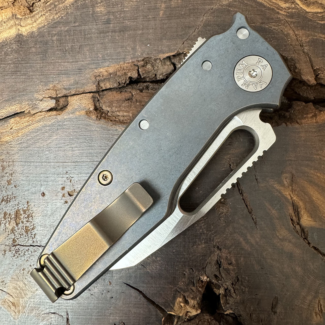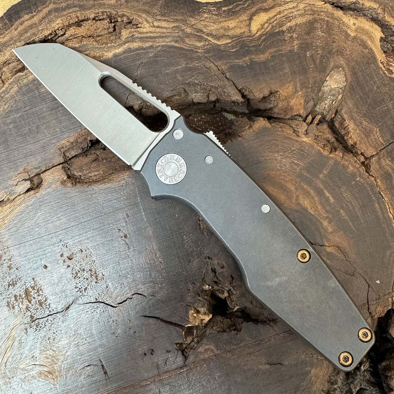 This Custom model features antique blue/bronze anodized titanium handle scales. Satin finished CPM-Magnacut shark foot blade. Bronze finished hardware and reversible deep carry clip. Brand new in box with pouch, patch, and polishing cloth.