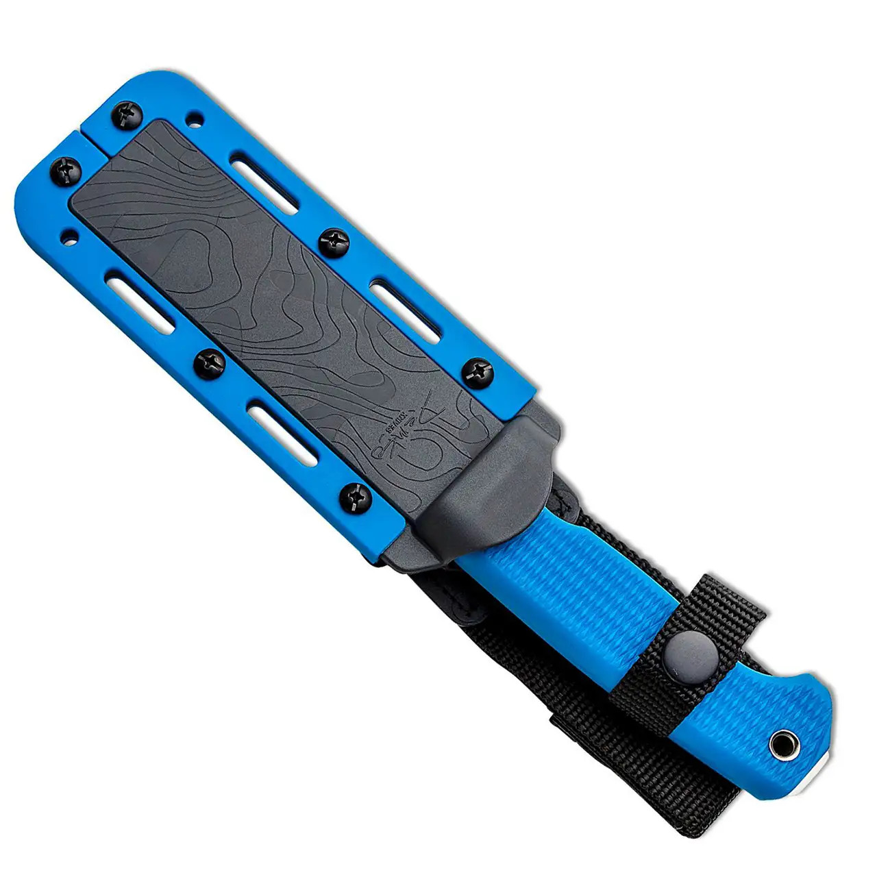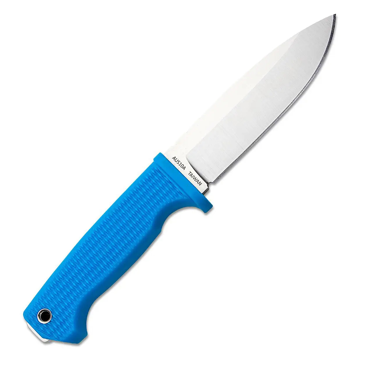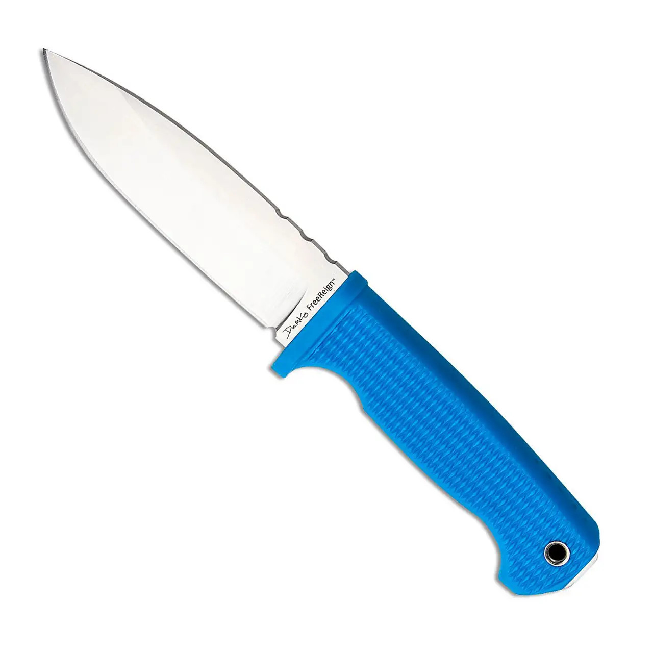 The FreeReign features an AUS10A satin finished drop point blade and a blue injection molded rubber handle. This fixed blade comes brand new in box with a blue/gray molded plastic sheath and nylon belt. Brand new in box.