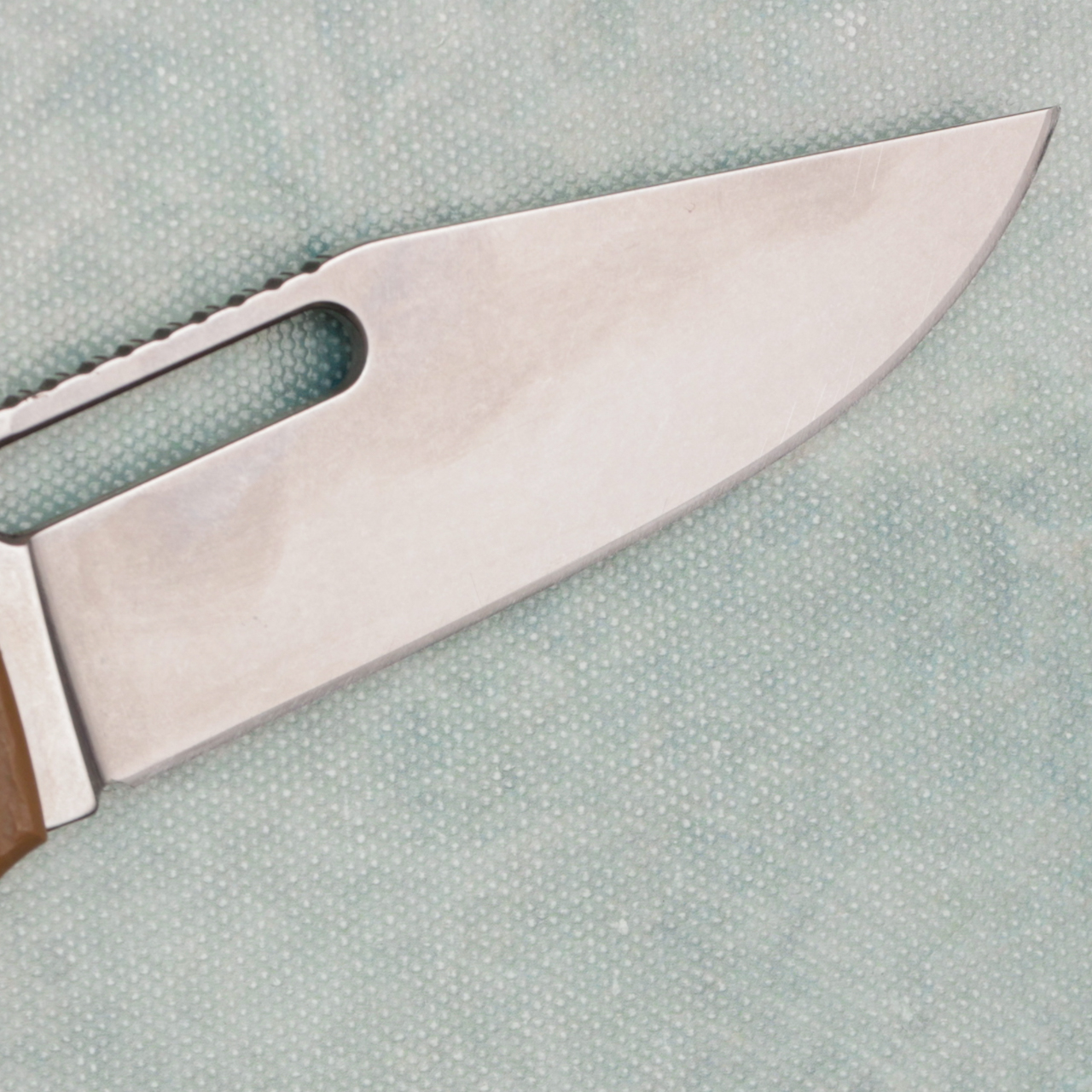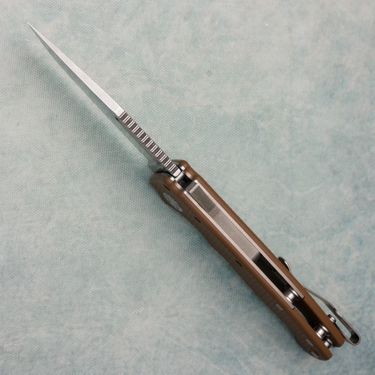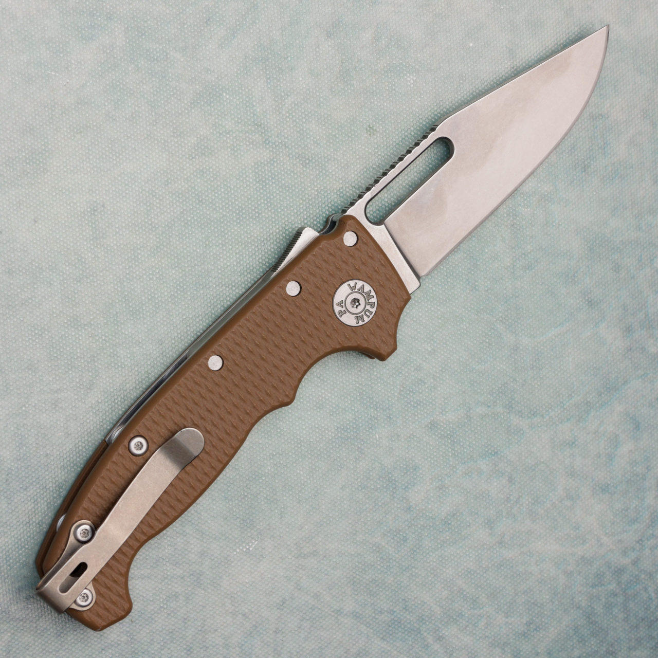 This model features earth g10 handle scales. Stonewash finished CPM-3V clip point blade with hole deployment. Satin finished hardware and a stonewashed deep carry Lynch pocket clip. Blade has several light scratches on it, no box.