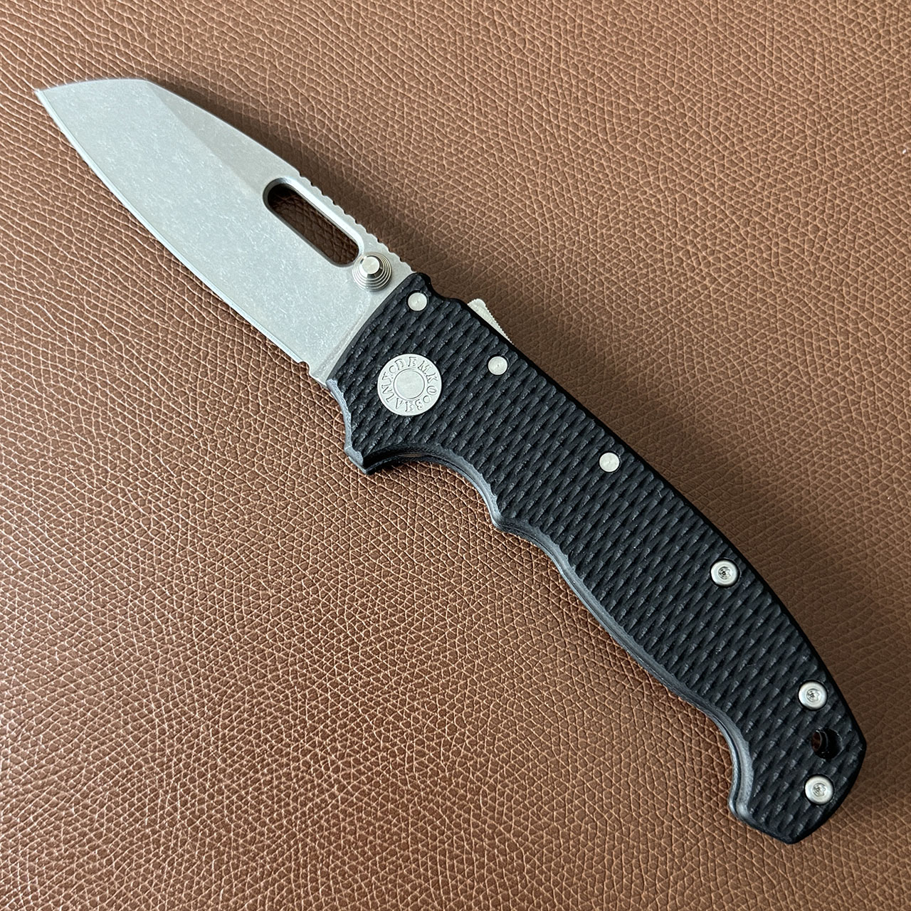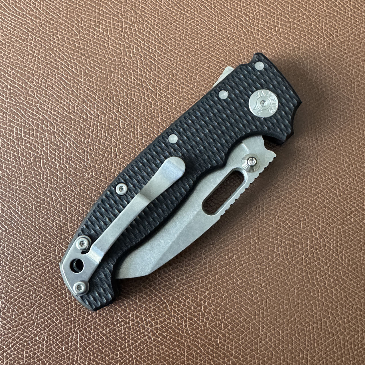This model features black g10 handle scales. Stonewash finished CPM-3V sharks foot blade with thumb stud and hole. Satin finished hardware and a stonewashed pocket clip. Brand new in box.