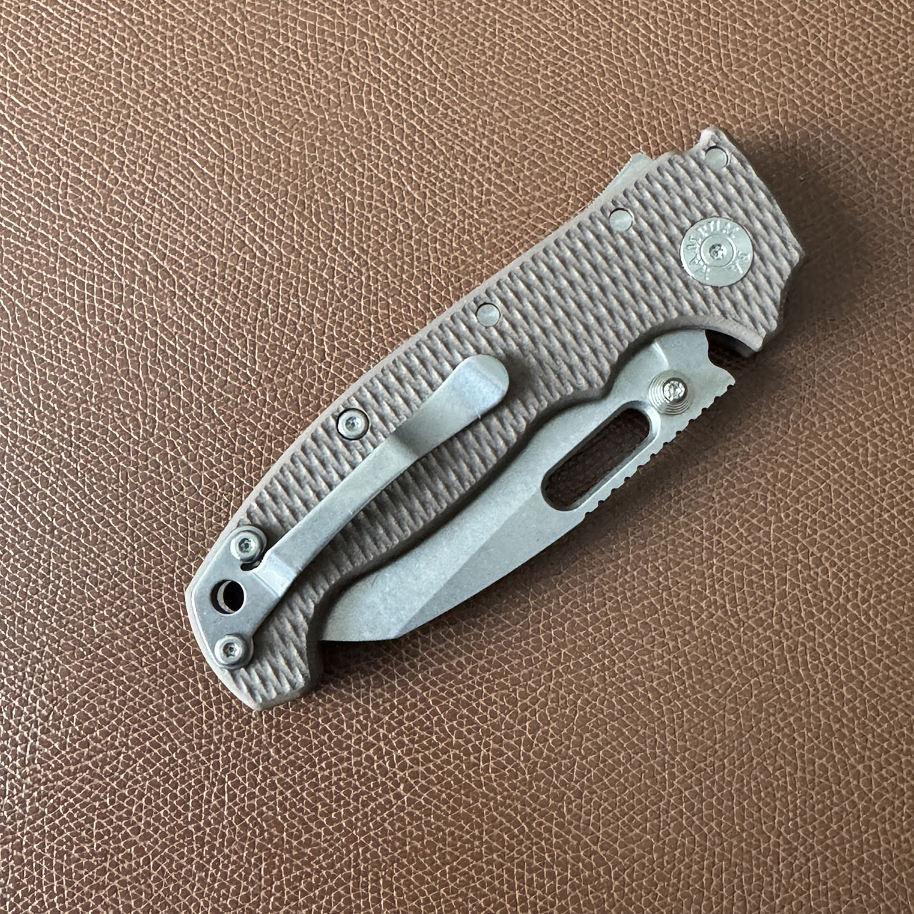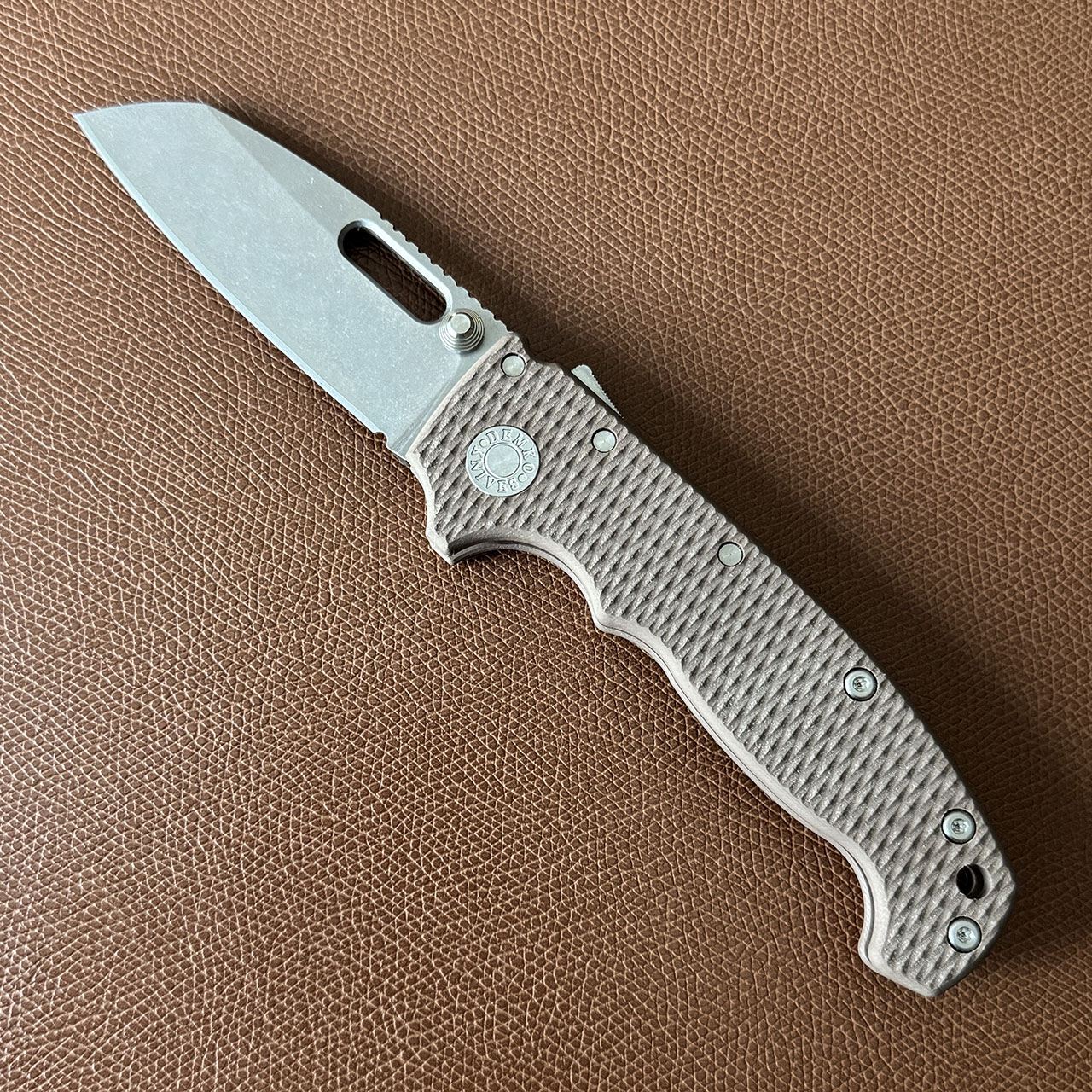 This model features earth g10 handle scales. Stonewash finished CPM-3V sharks foot blade with thumb stud and hole. Satin finished hardware and a stonewashed pocket clip. Brand new in box.