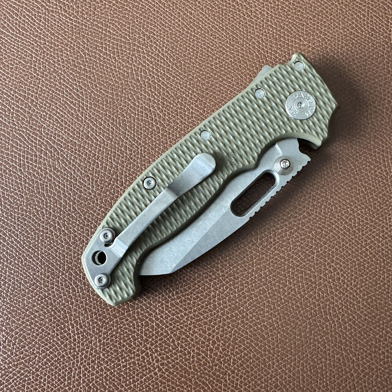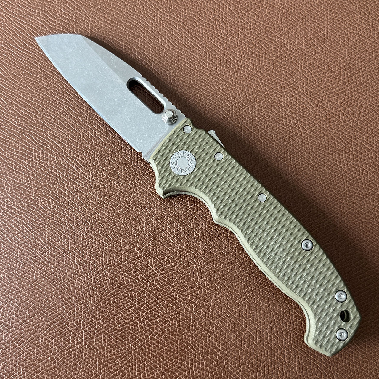 This model features OD Green g10 handle scales. Stonewash finished CPM-3V sharks foot blade with thumb stud and hole. Satin finished hardware and a stonewashed pocket clip. Brand new in box.