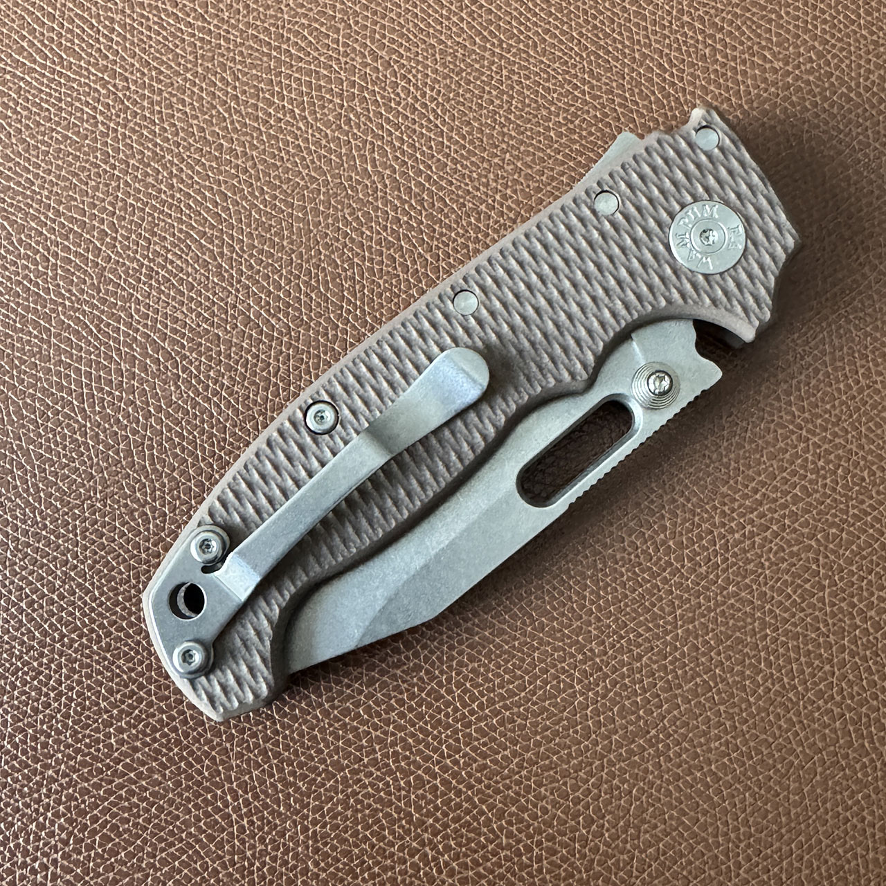 This model features brown g10 handle scales. Stonewash finished MagnaCut clip point V2 blade with thumb stud and hole. Satin finished hardware and a stonewashed pocket clip. Brand new in box.