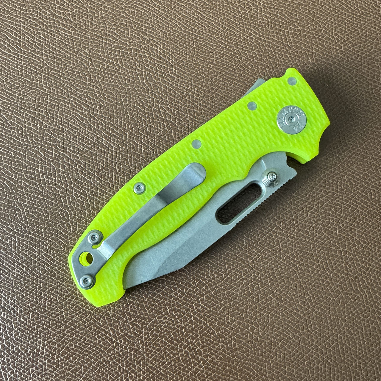This model features day glow g10 handle scales. Stonewash finished MagnaCut clip point V2 blade with thumb stud and hole. Satin finished hardware and a stonewashed pocket clip. Brand new in box.