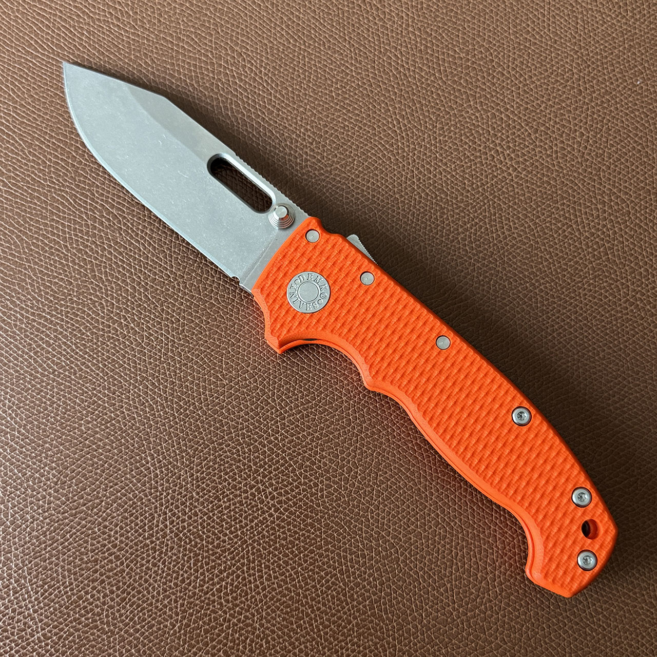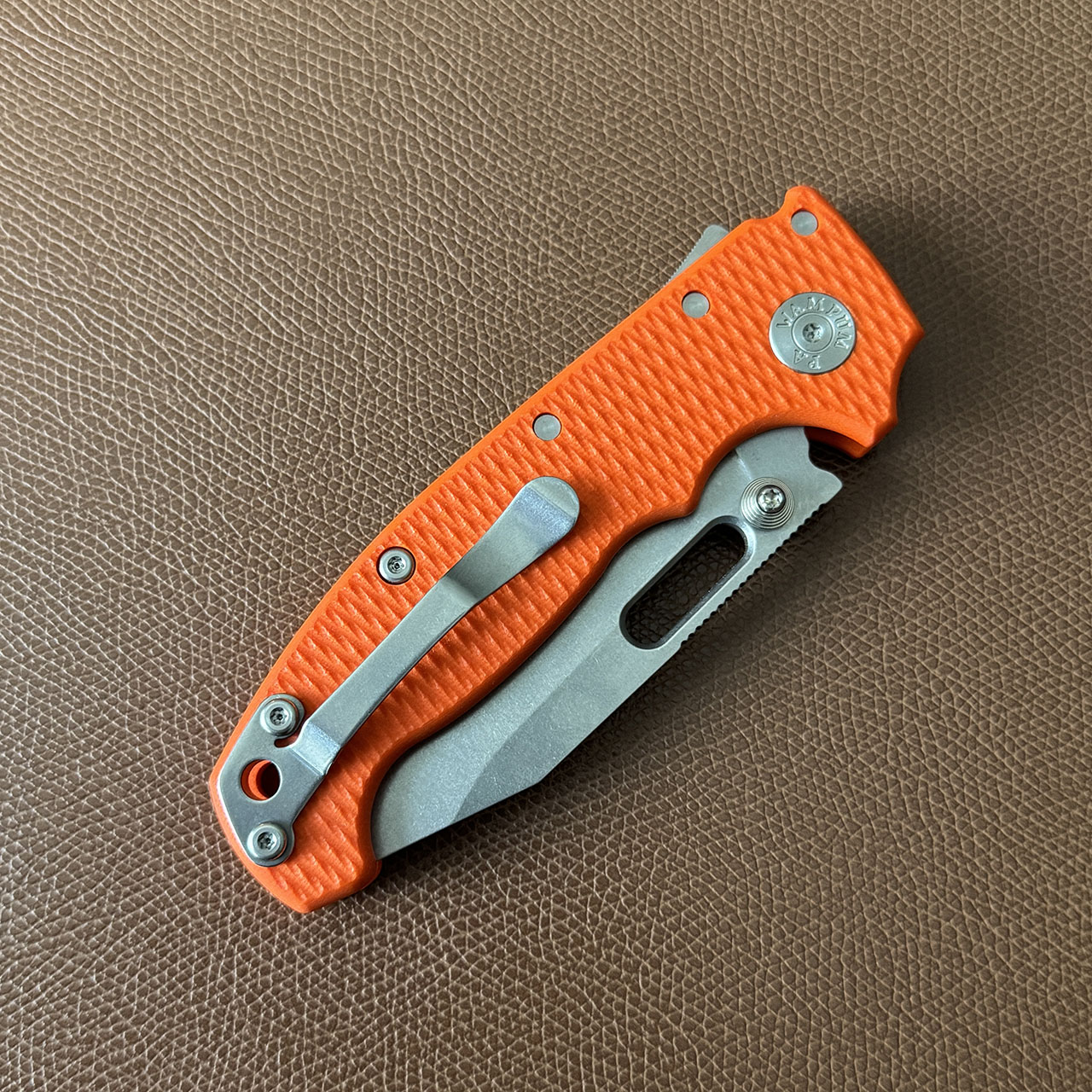 This model features orange g10 handle scales. Stonewash finished MagnaCut clip point V2 blade with thumb stud and hole. Satin finished hardware and a stonewashed pocket clip. Brand new in box.