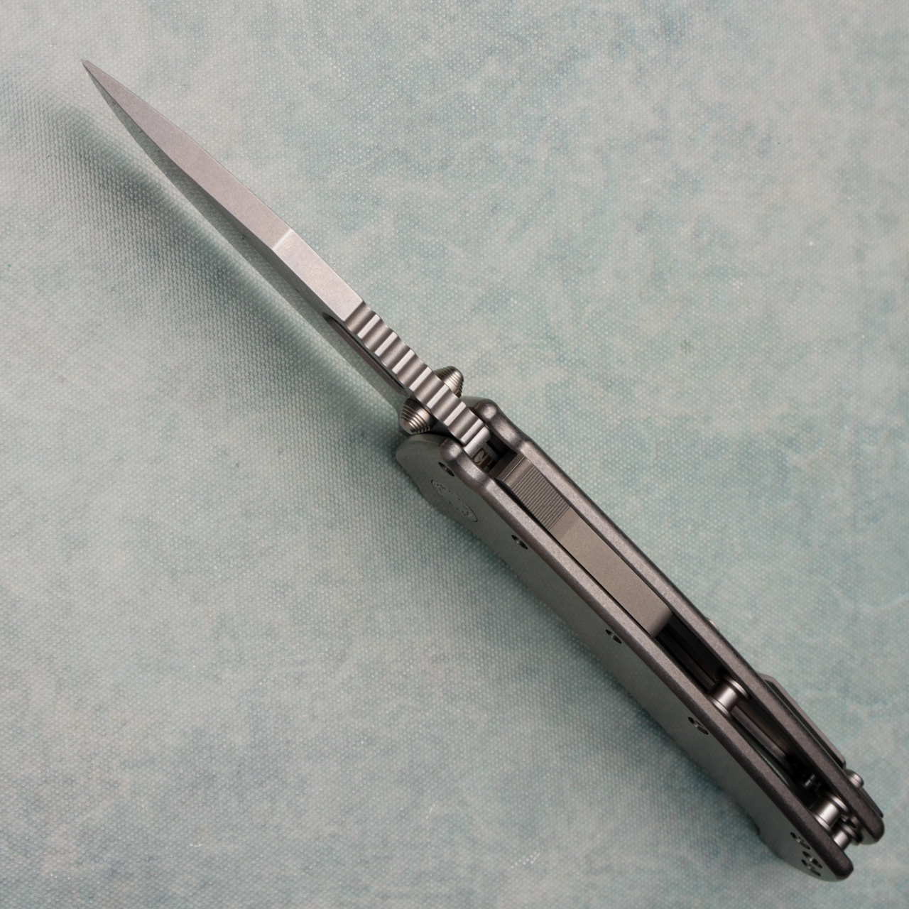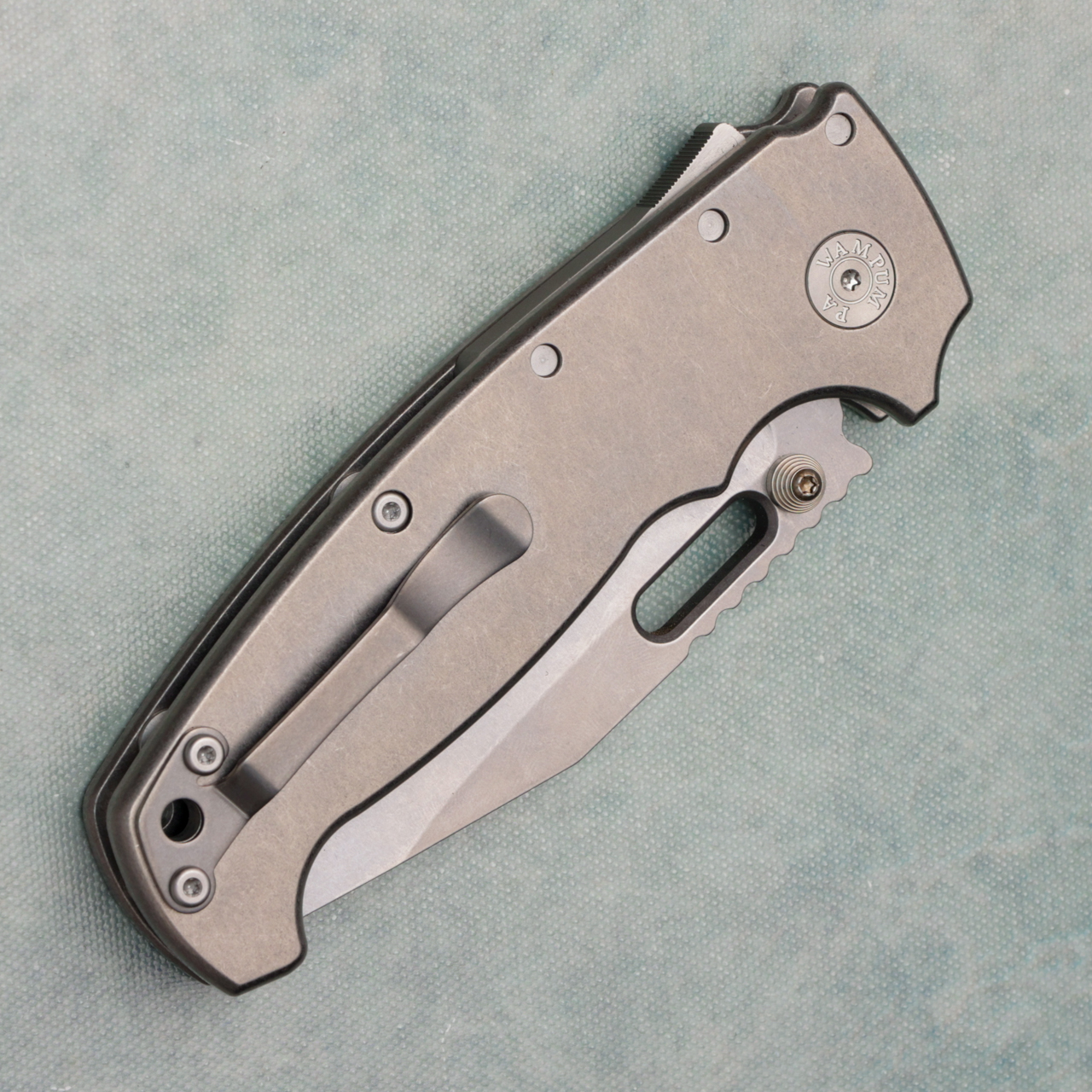 This XXX model features titanium handle scales. Stonewash finished CPM-3V clip point blade with thumbstuds and hole. Satin finished hardware and a stonewashed pocket clip. Brand new in box.
