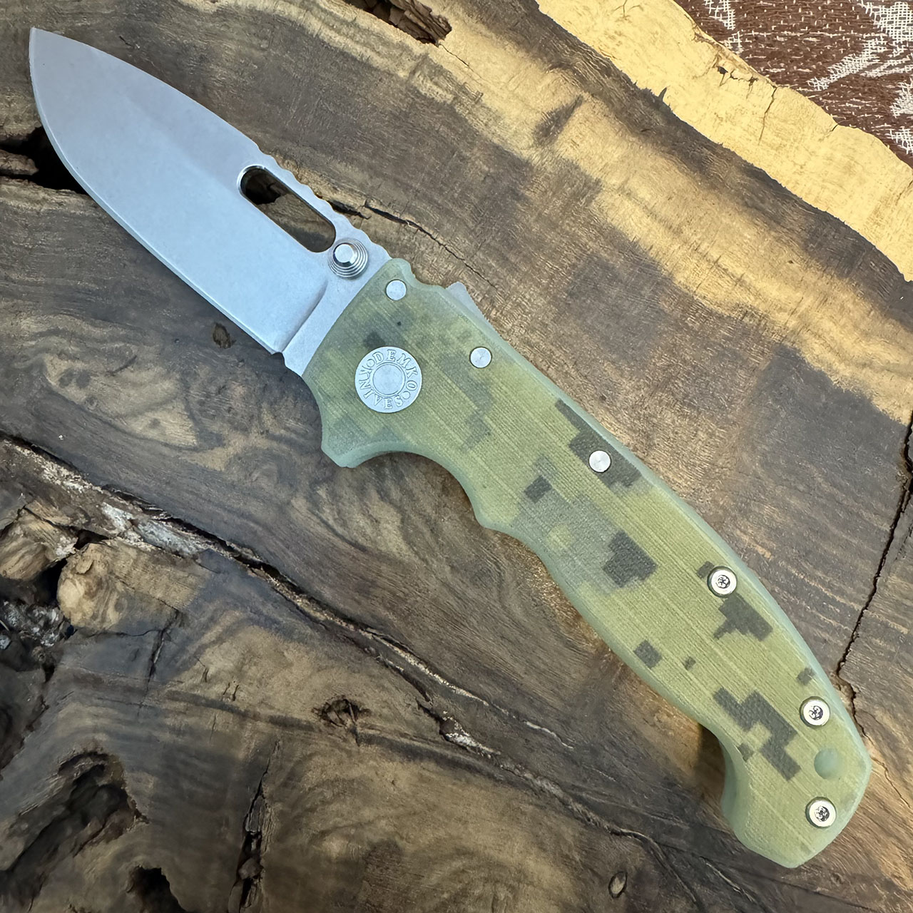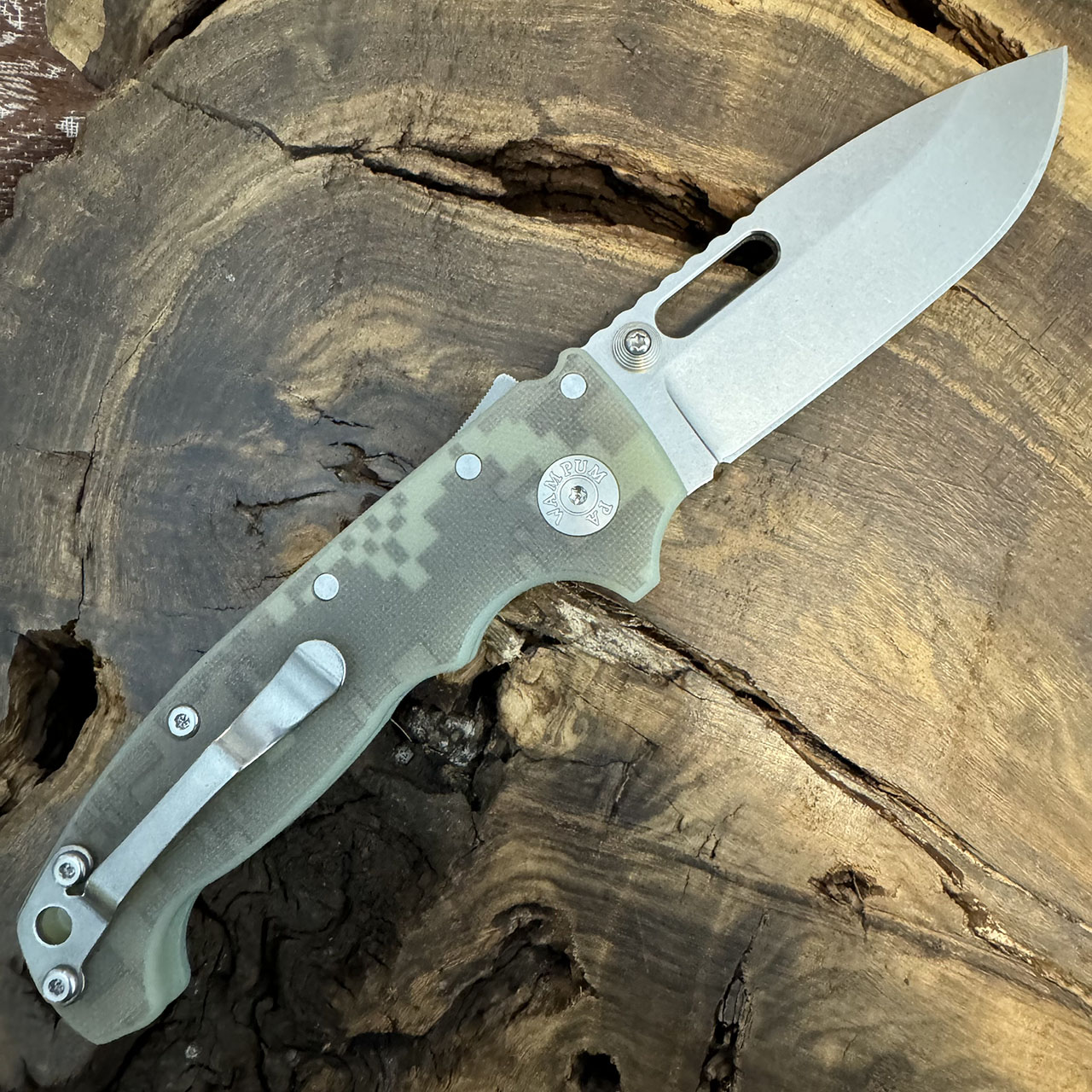 This model features camo G10 scales. Stonewash finished CPM-20CV stainless steel clip point blade. Satin finished hardware and a stonewashed pocket clip. Brand new in box.