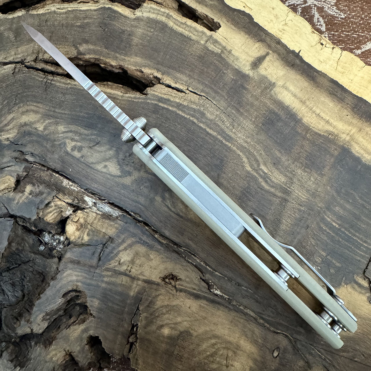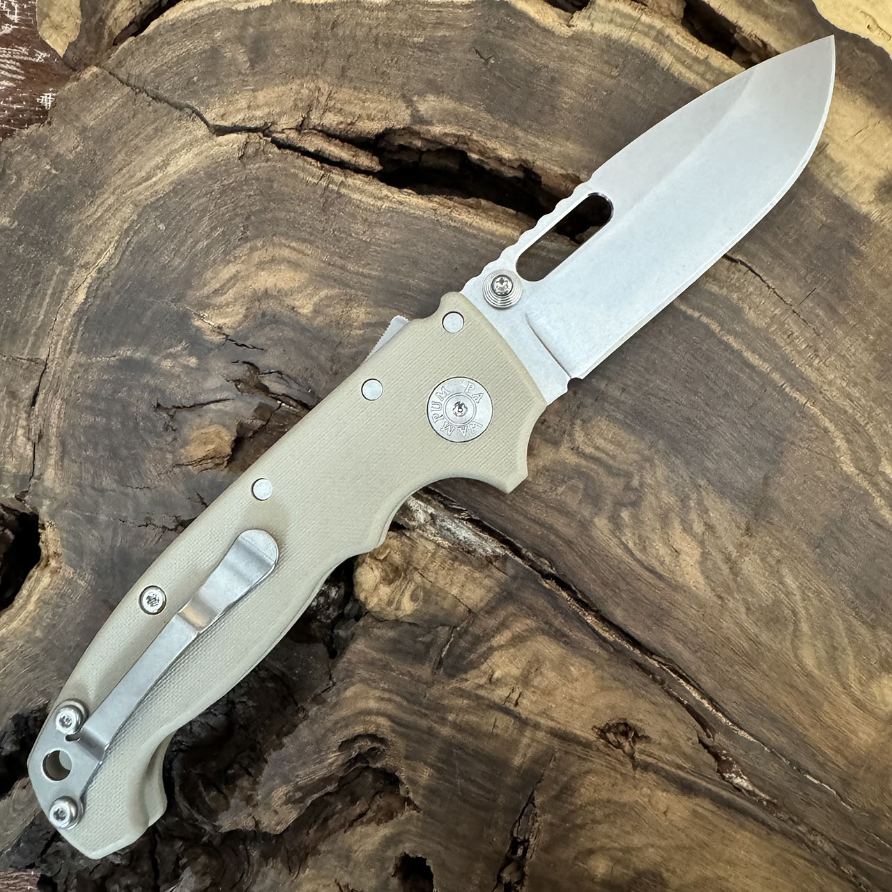 This model features light brown G-10 scales. Stonewash finished CPM-20CV stainless steel clip point blade. Satin finished hardware and a stonewashed pocket clip. Brand new in box.