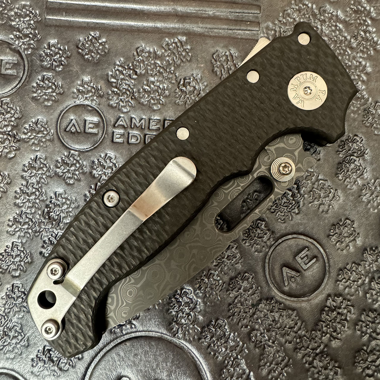 This model features textured carbon fiber scales. Damascus spear point blade. Satin finished hardware and a stonewashed pocket clip. Brand new in box.