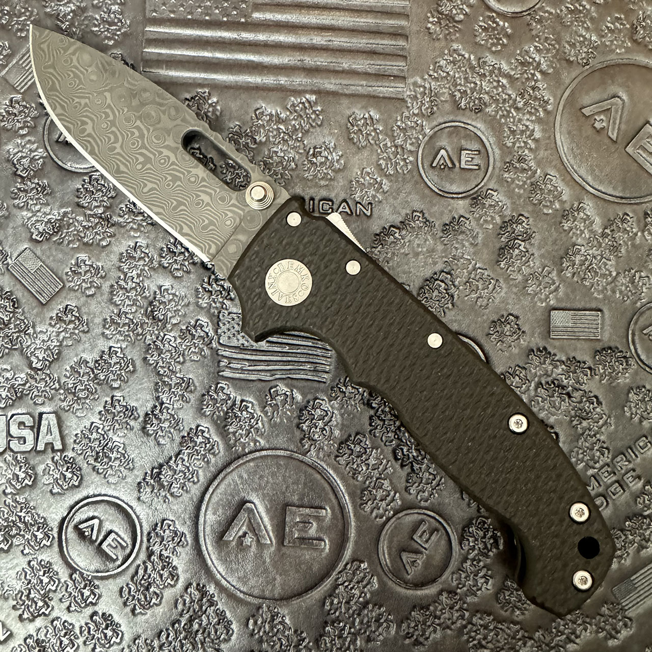 Demko MG AD20i Shark Lock Textured Carbon Fiber Handle Damascus Spear Point Blade