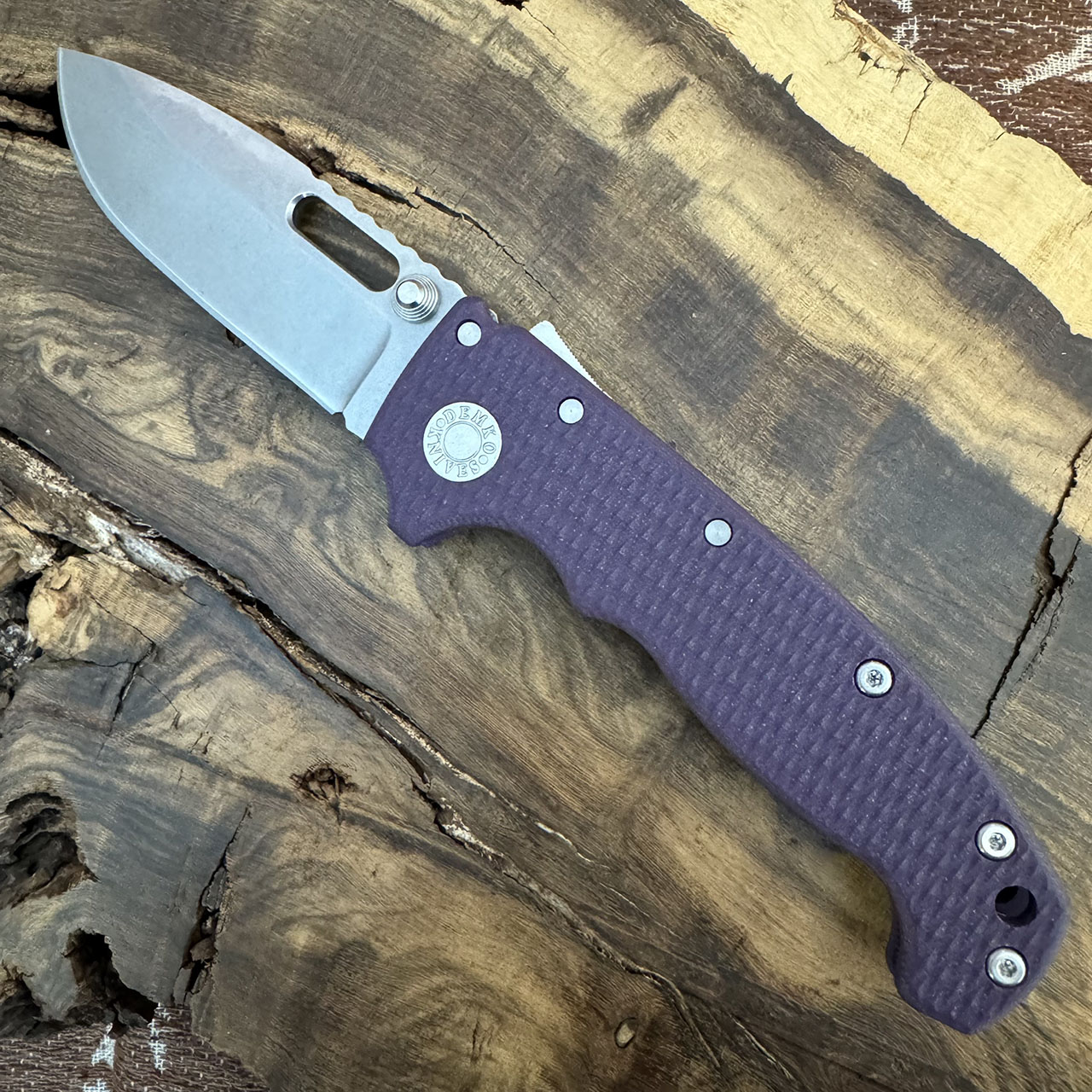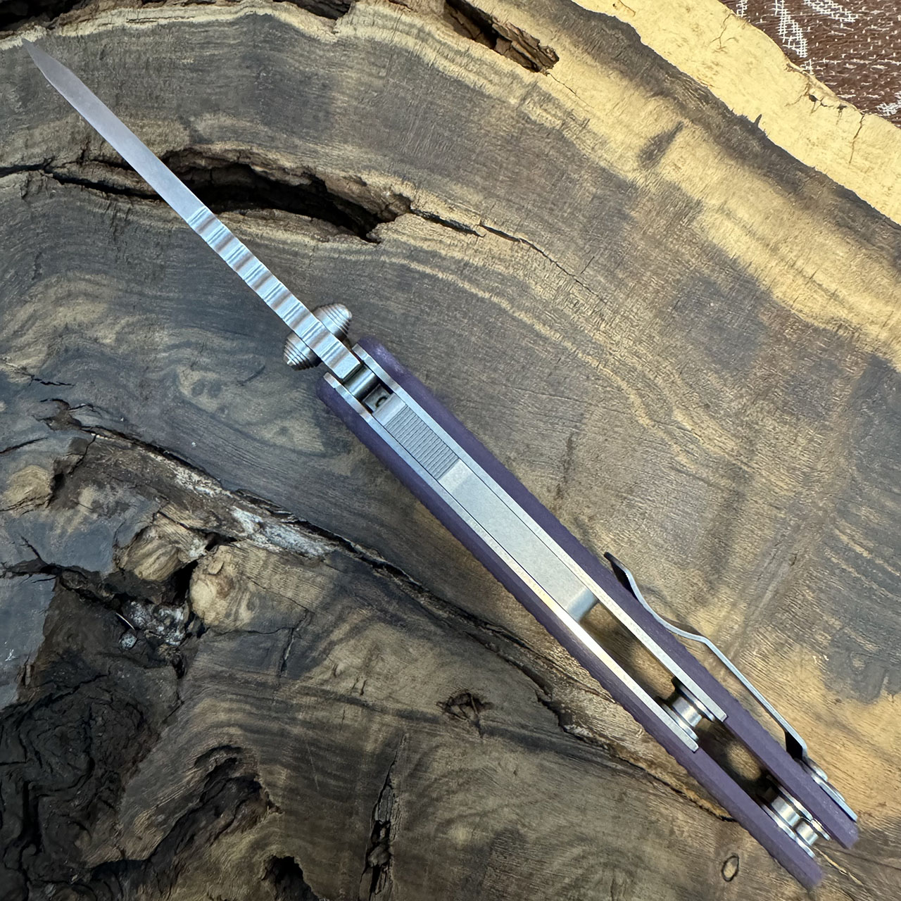This model features purple textured G10 scales. Stonewash finished CPM-20CV stainless steel clip point blade. Satin finished hardware and a stonewashed pocket clip. Brand new in box.