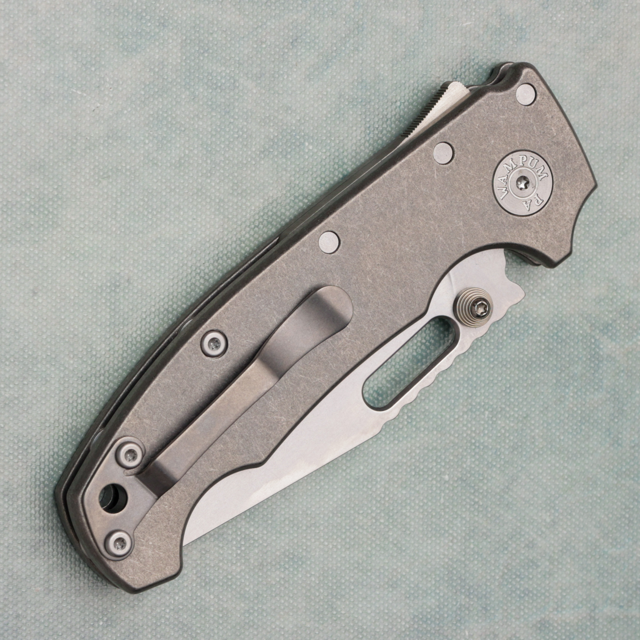 This model features titanium K1 scales. Stonewash finished Nitro-X7 stainless steel clip point blade. Satin finished hardware and a stonewashed pocket clip. Brand new in box.