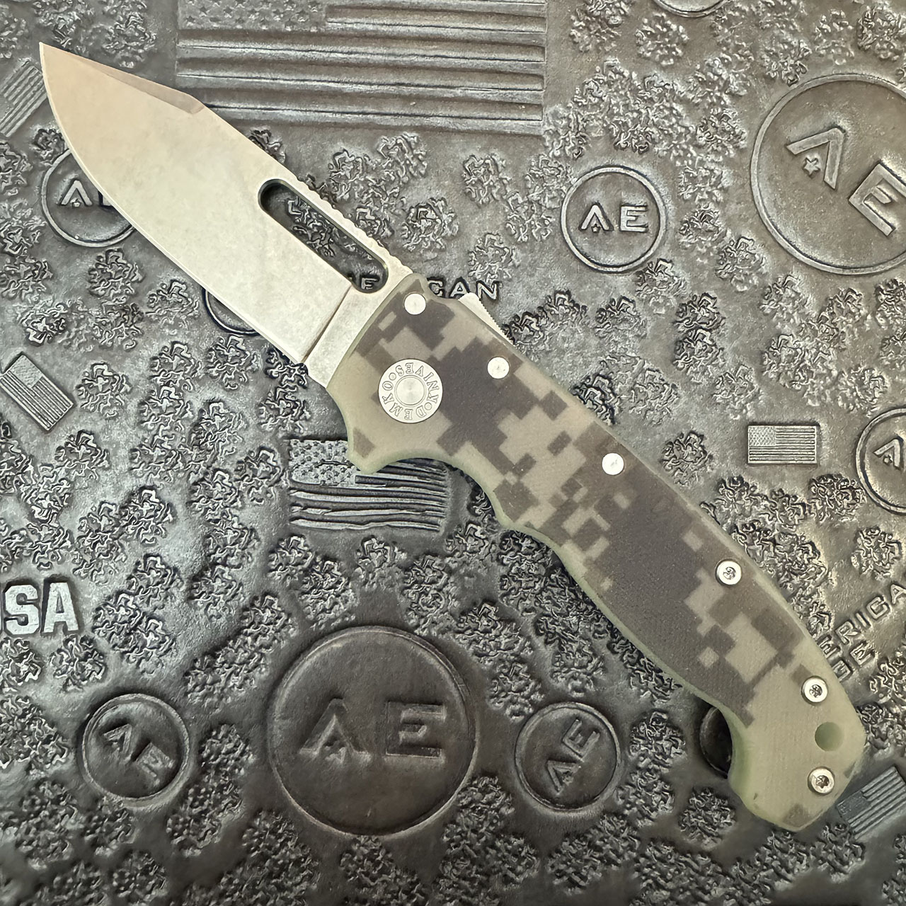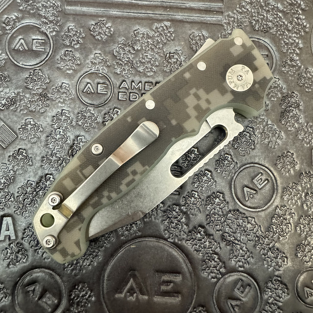 This model features camo g10 handle scales. Stonewash finished flat ground CPM-MagnaCut stainless steel clip point blade. Satin finished hardware and a stonewashed pocket clip. Brand new in box .