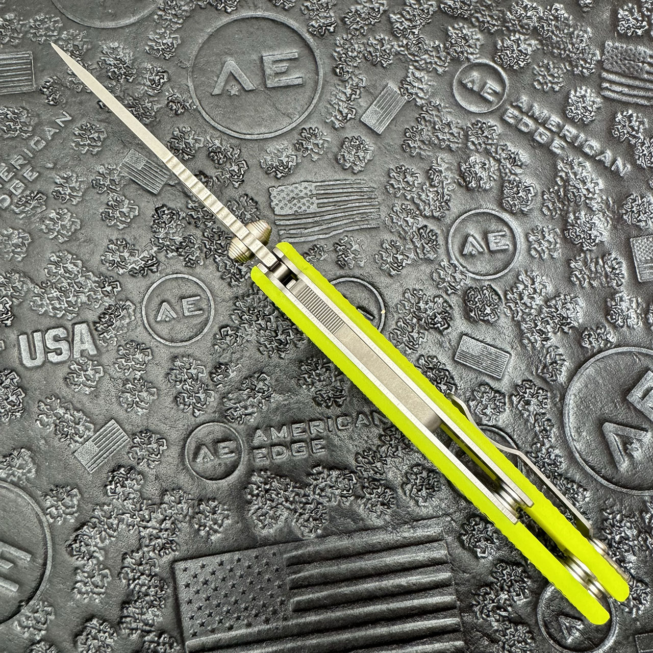 This model features textured dayglow g10 handle scales. Stonewash finished CPM-20CV stainless steel clip point blade with thumbstuds, and hole. Satin finished hardware and a stonewashed pocket clip. Brand new in box .