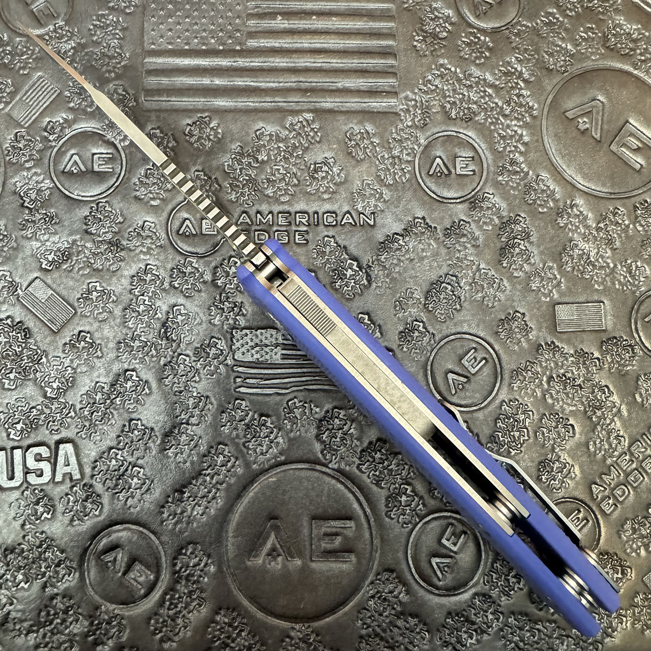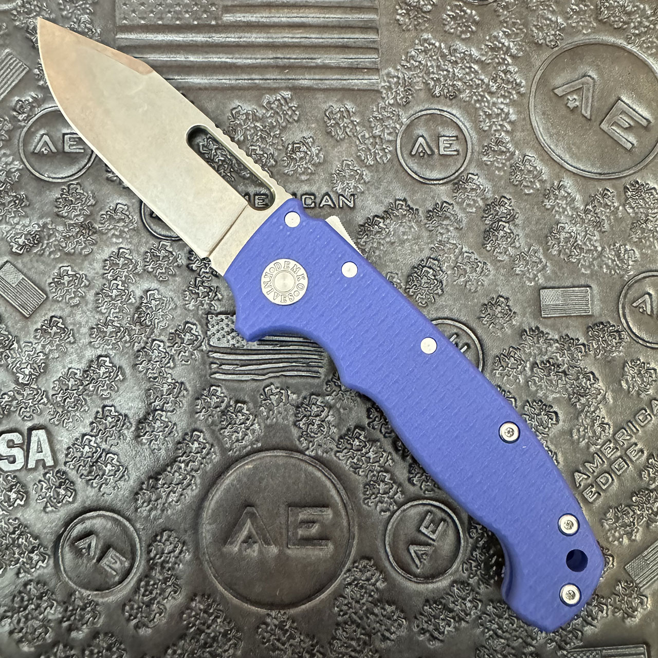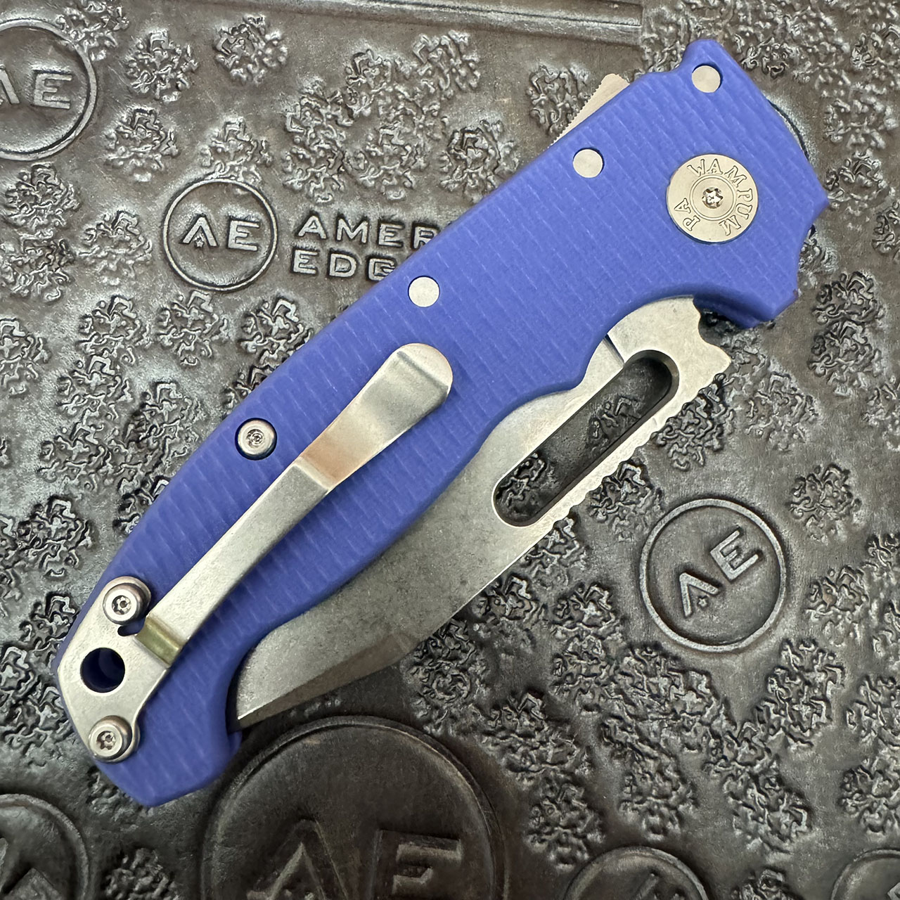 This model features blue g10 handle scales. Stonewash finished flat ground CPM-MagnaCut stainless steel clip point blade. Satin finished hardware and a stonewashed pocket clip. Brand new in box .