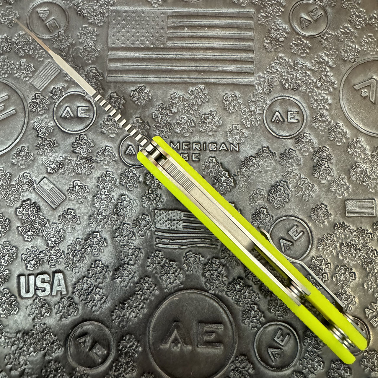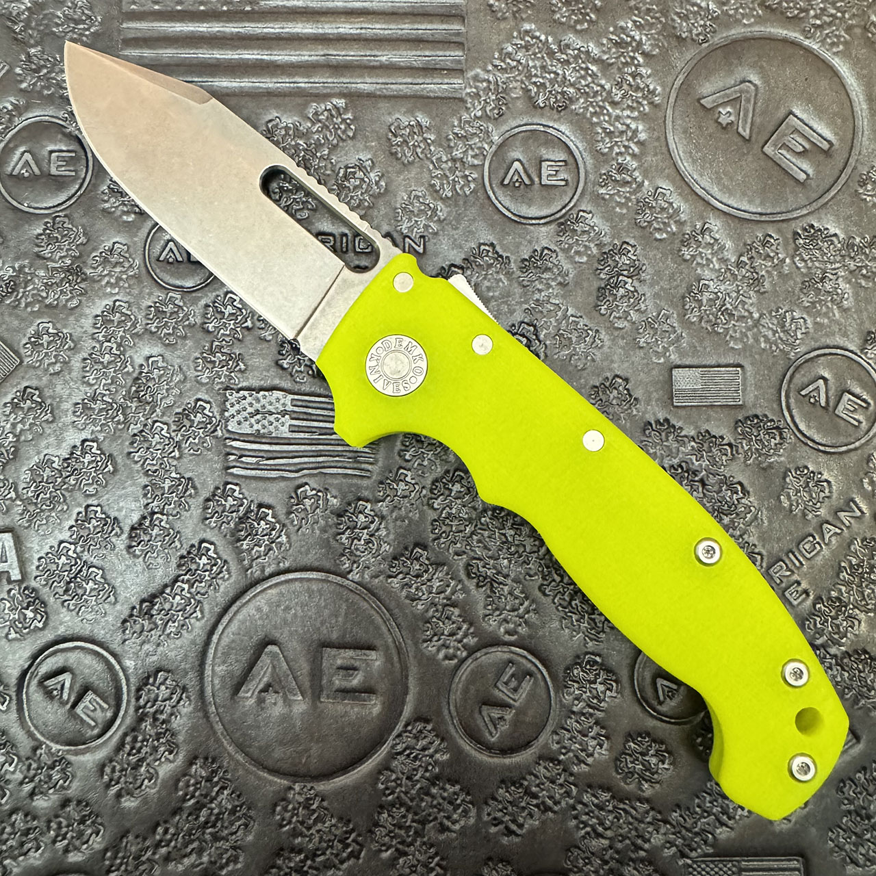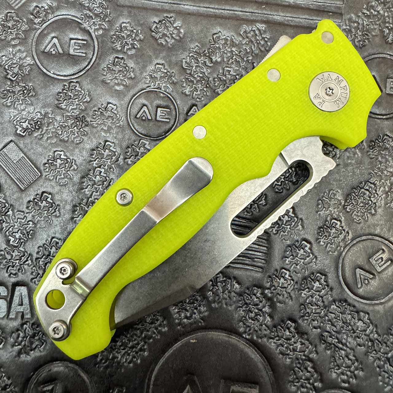 This model features dayglow g10 handle scales. Stonewash finished flat ground CPM-MagnaCut stainless steel clip point blade. Satin finished hardware and a stonewashed pocket clip. Brand new in box .