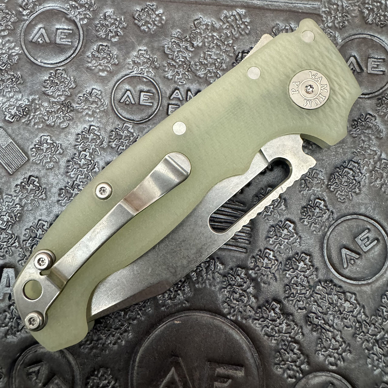 This model features natural g10 handle scales. Stonewash finished flat ground CPM-MagnaCut stainless steel clip point blade. Satin finished hardware and a stonewashed pocket clip. Brand new in box .