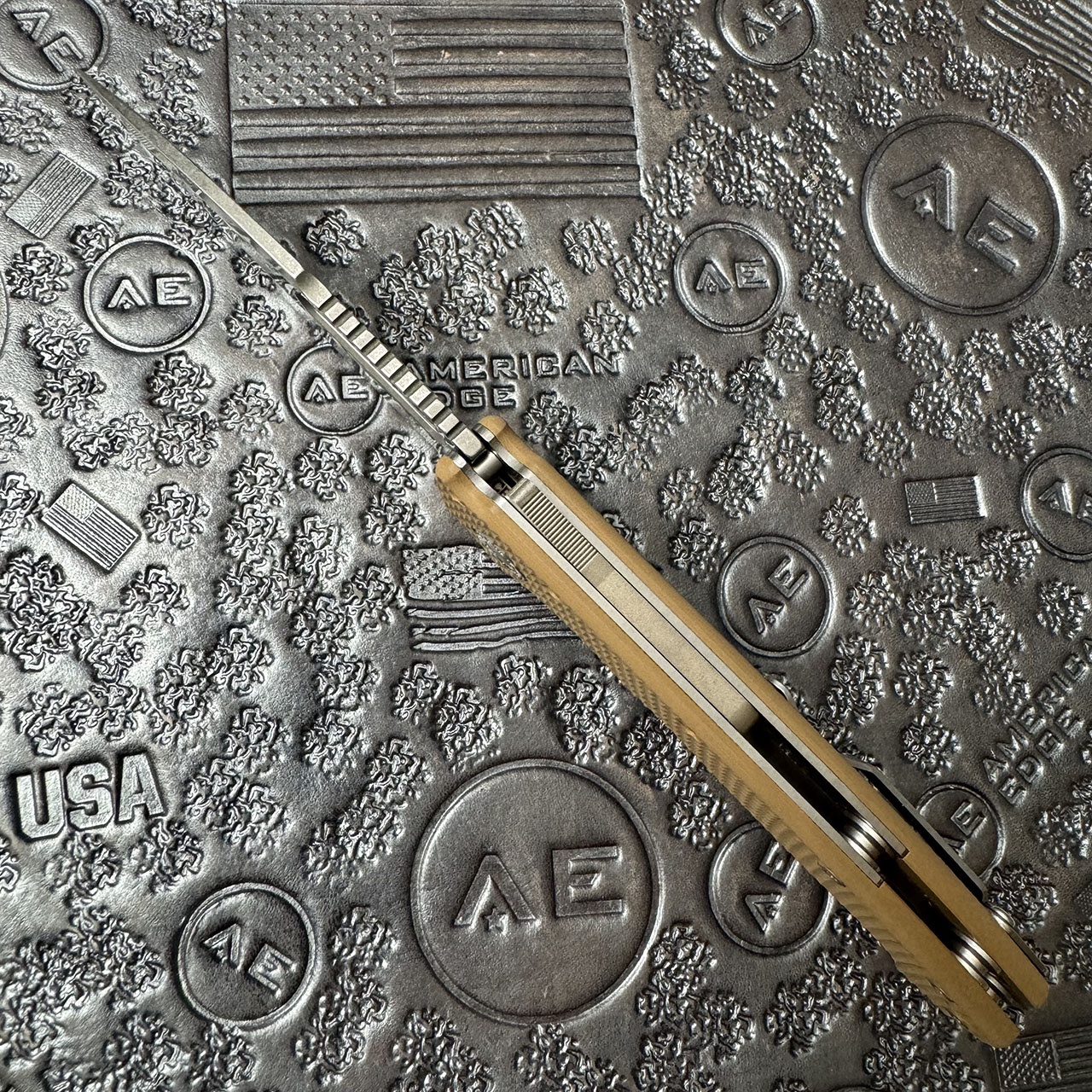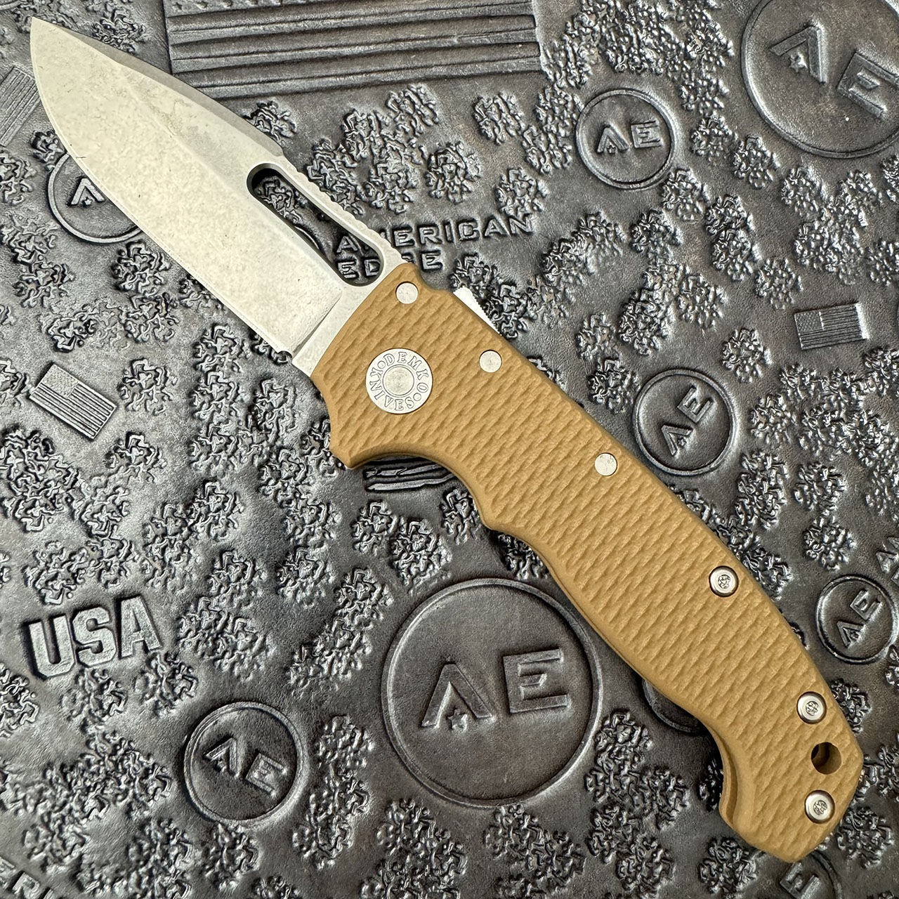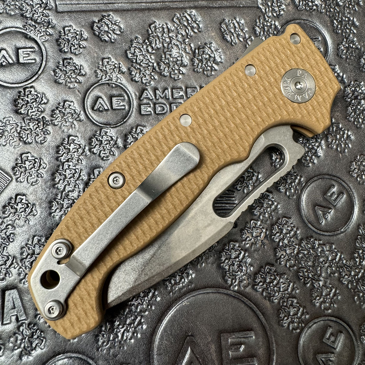 This American Edge exclusive model features brown G10 handle scales. Stonewash finished CPM-20CV stainless steel harpoon drop blade. Satin finished hardware and a stonewashed pocket clip. Brand new in box.
