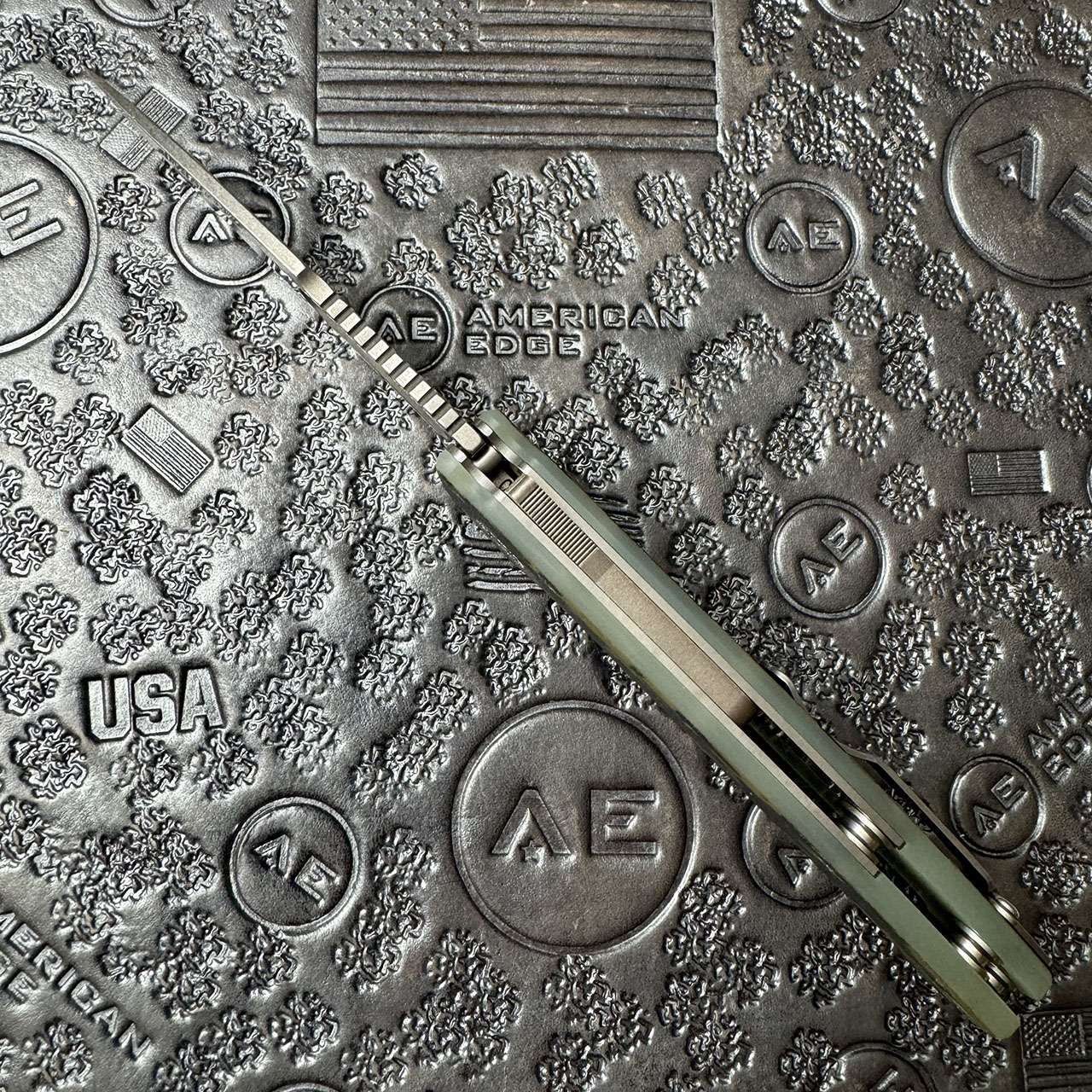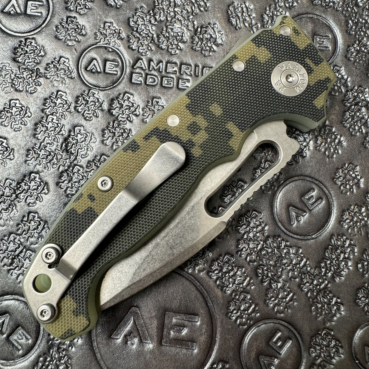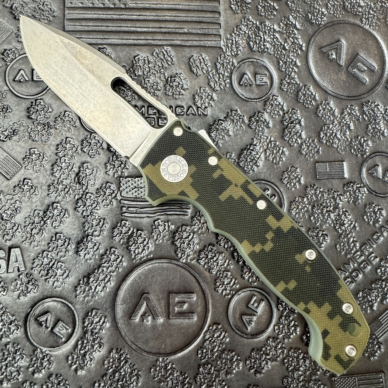 This American Edge exclusive model features camo G10 handle scales. Stonewash finished CPM-20CV stainless steel harpoon drop blade. Satin finished hardware and a stonewashed pocket clip. Brand new in box.