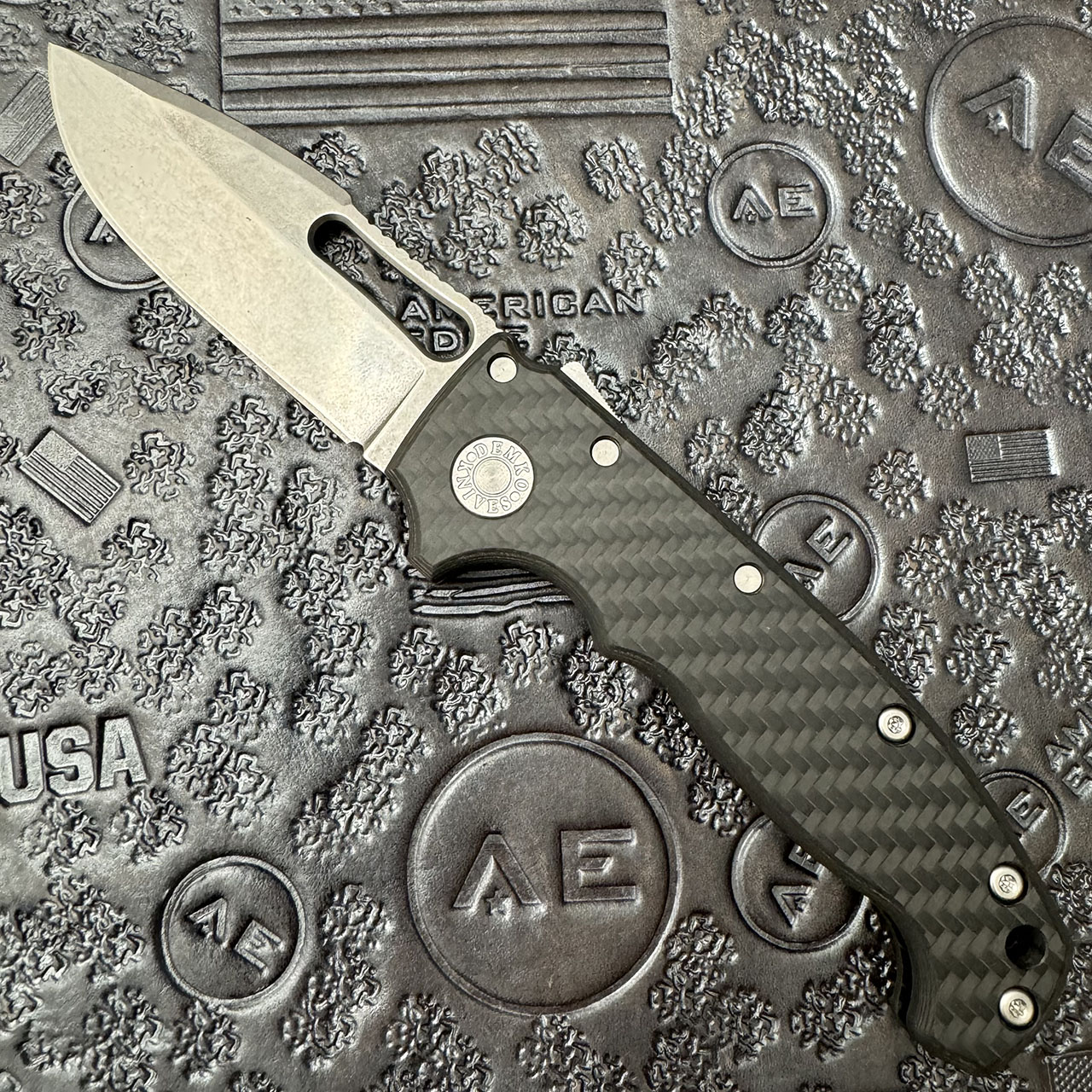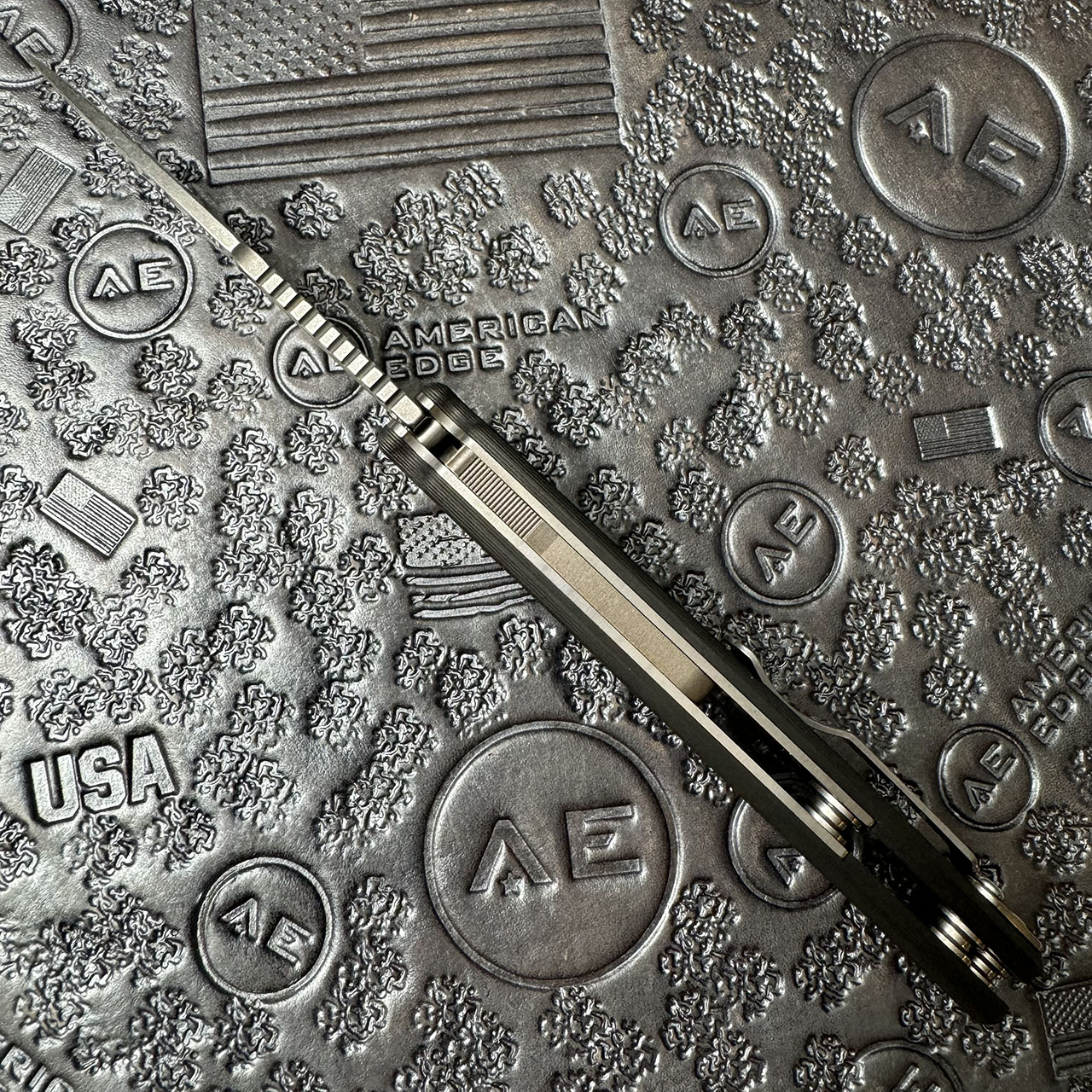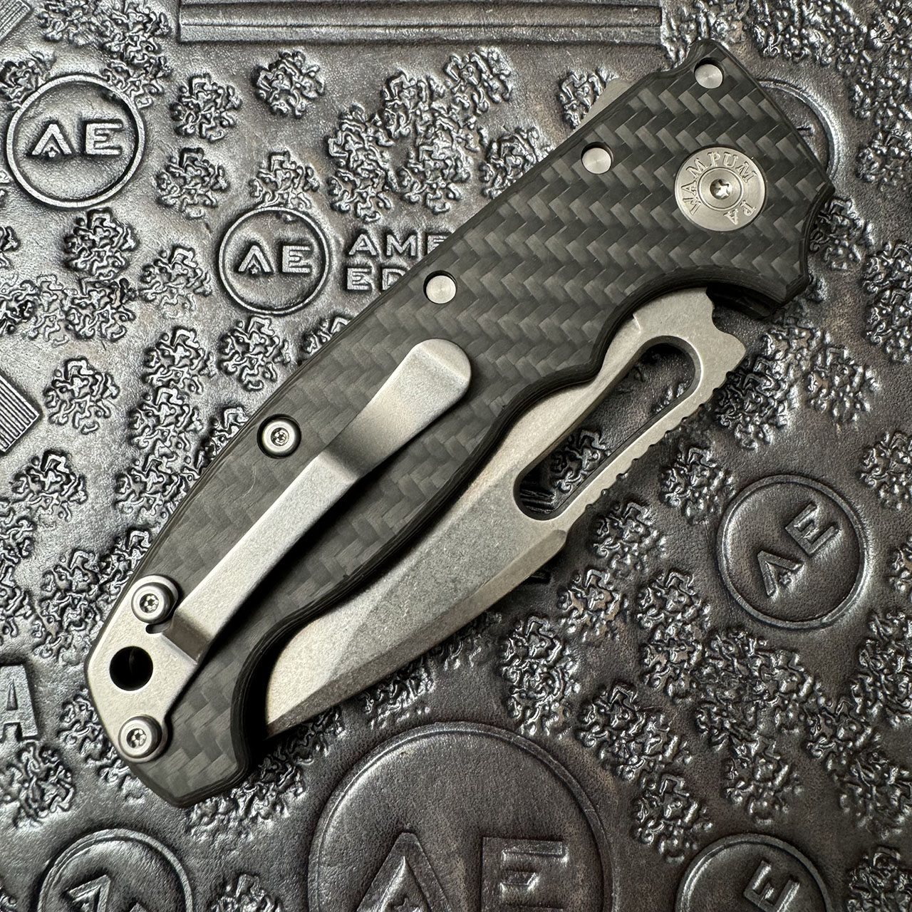 This American Edge exclusive model features carbon fiber handle scales. Stonewash finished CPM-20CV stainless steel harpoon drop blade. Satin finished hardware and a stonewashed pocket clip. Brand new in box.