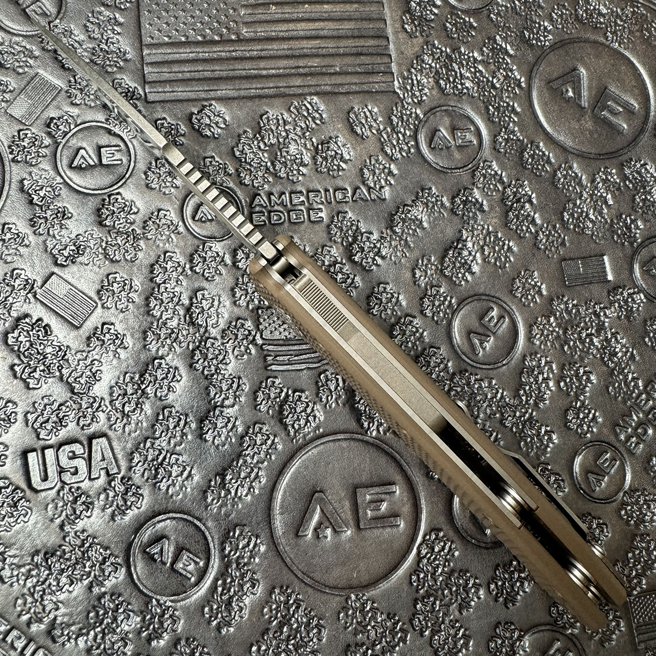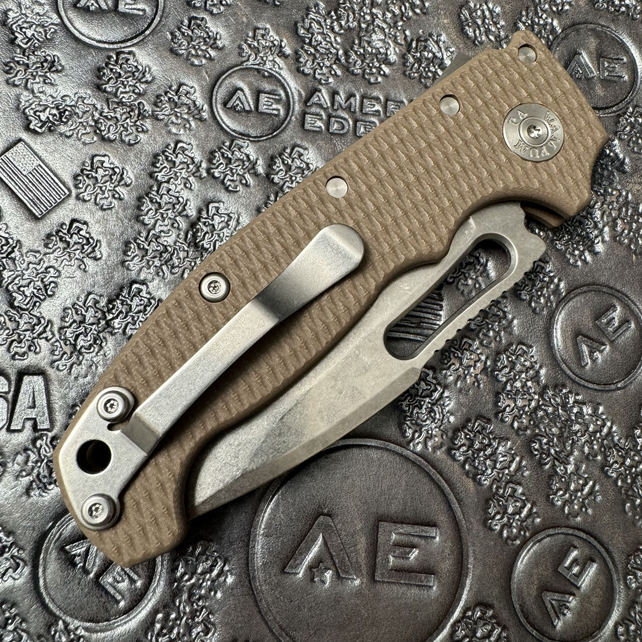 This American Edge exclusive model features earth G10 handle scales. Stonewash finished CPM-20CV stainless steel harpoon drop blade. Satin finished hardware and a stonewashed pocket clip. Brand new in box.