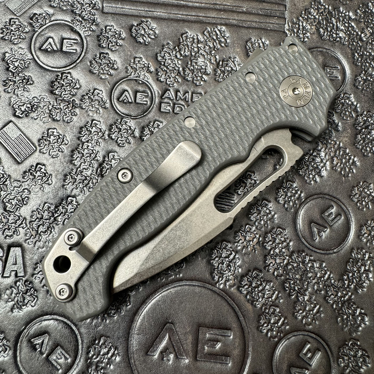 This American Edge exclusive model features grey G10 handle scales. Stonewash finished CPM-20CV stainless steel harpoon drop blade. Satin finished hardware and a stonewashed pocket clip. Brand new in box.