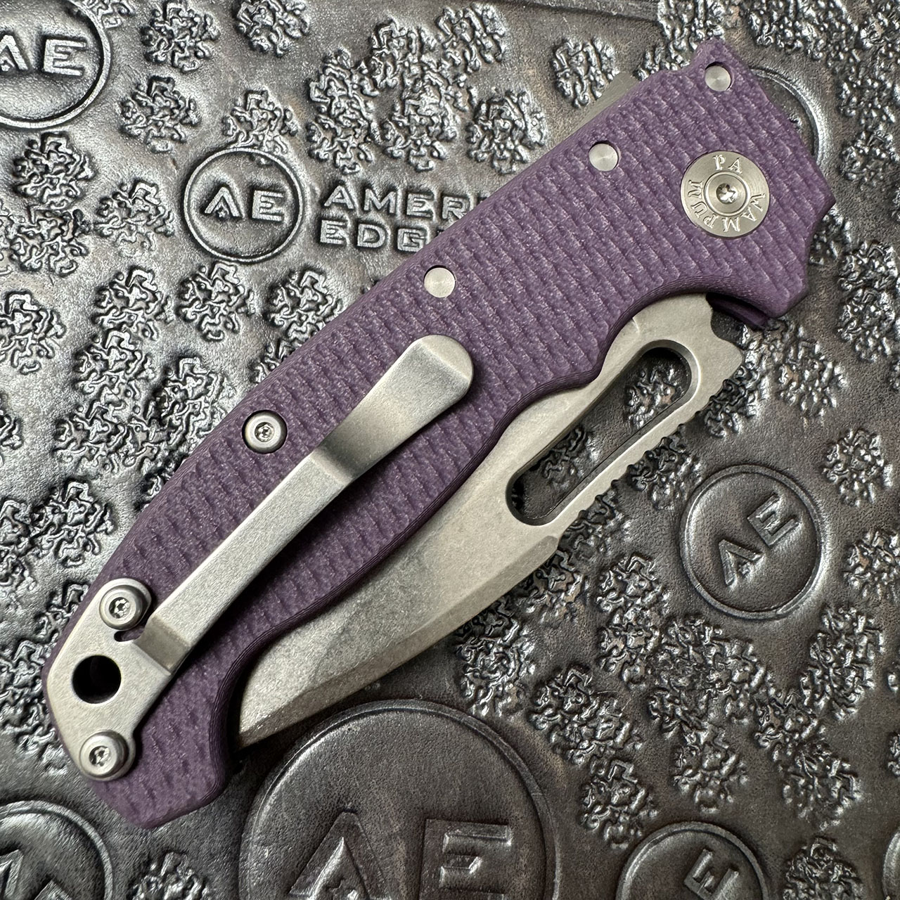 This American Edge exclusive model features purple G10 handle scales. Stonewash finished CPM-20CV stainless steel harpoon drop blade. Satin finished hardware and a stonewashed pocket clip. Brand new in box.