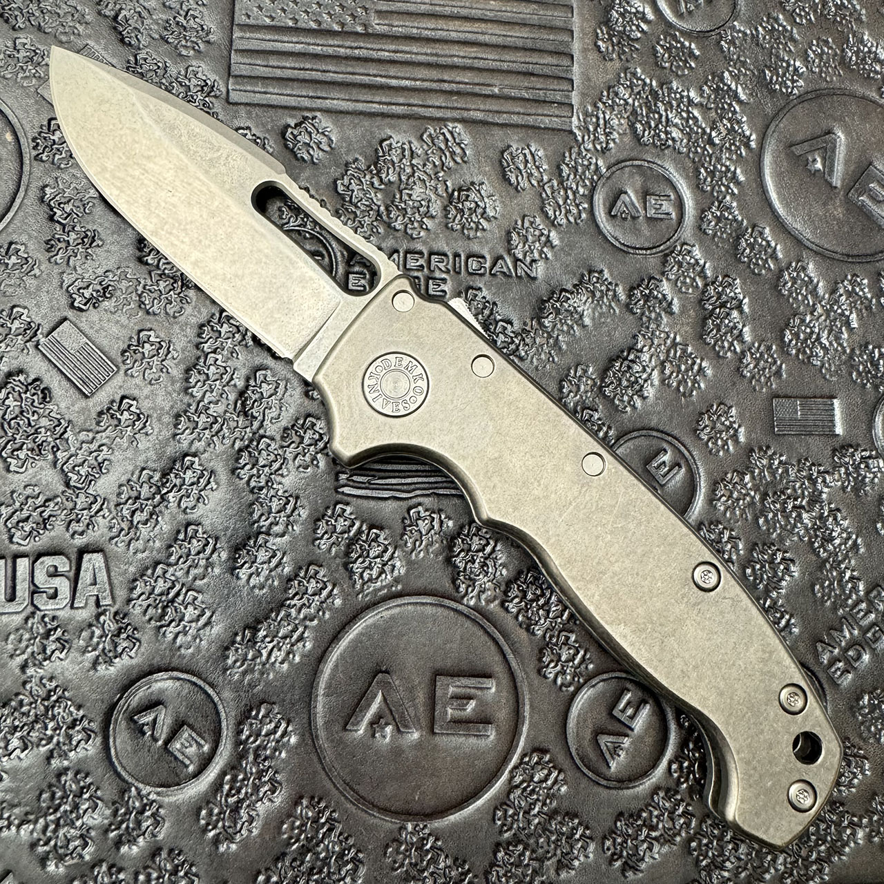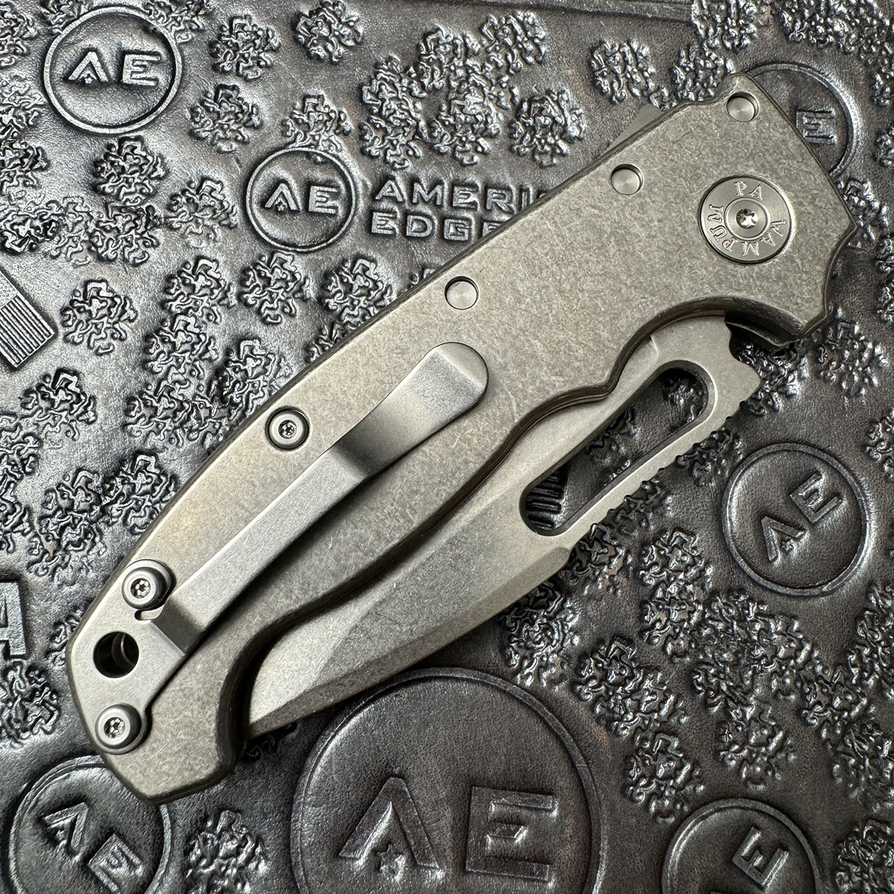 This American Edge exclusive model features smooth titanium handle scales. Stonewash finished CPM-20CV stainless steel harpoon drop blade. Satin finished hardware and a stonewashed pocket clip. Brand new in box.