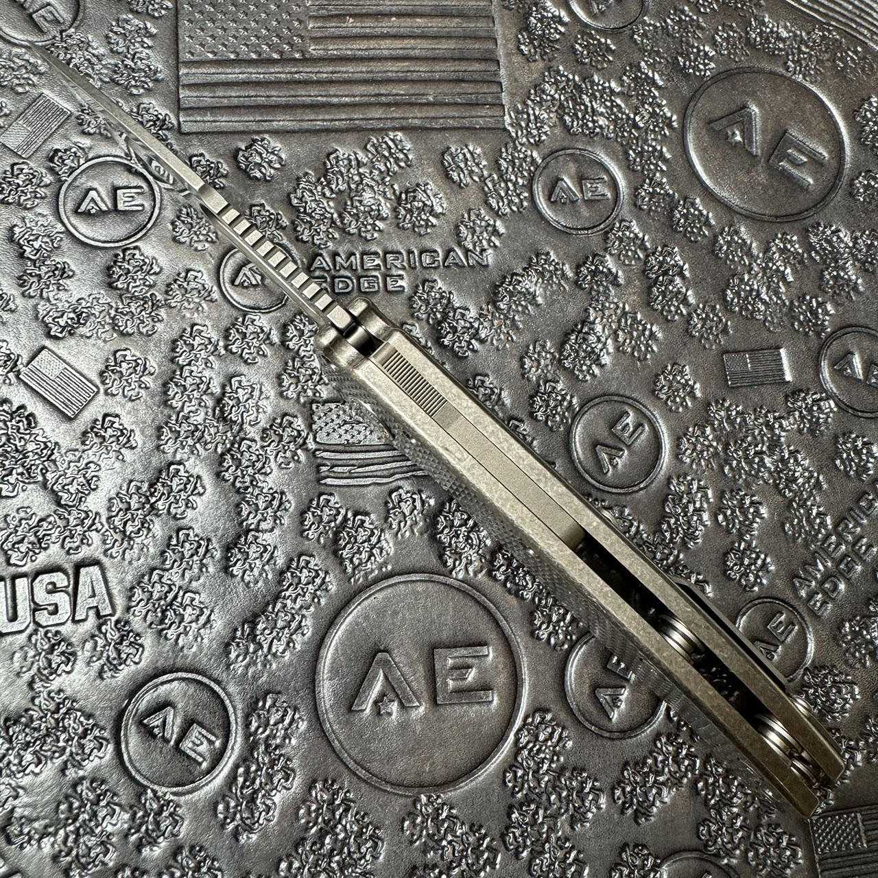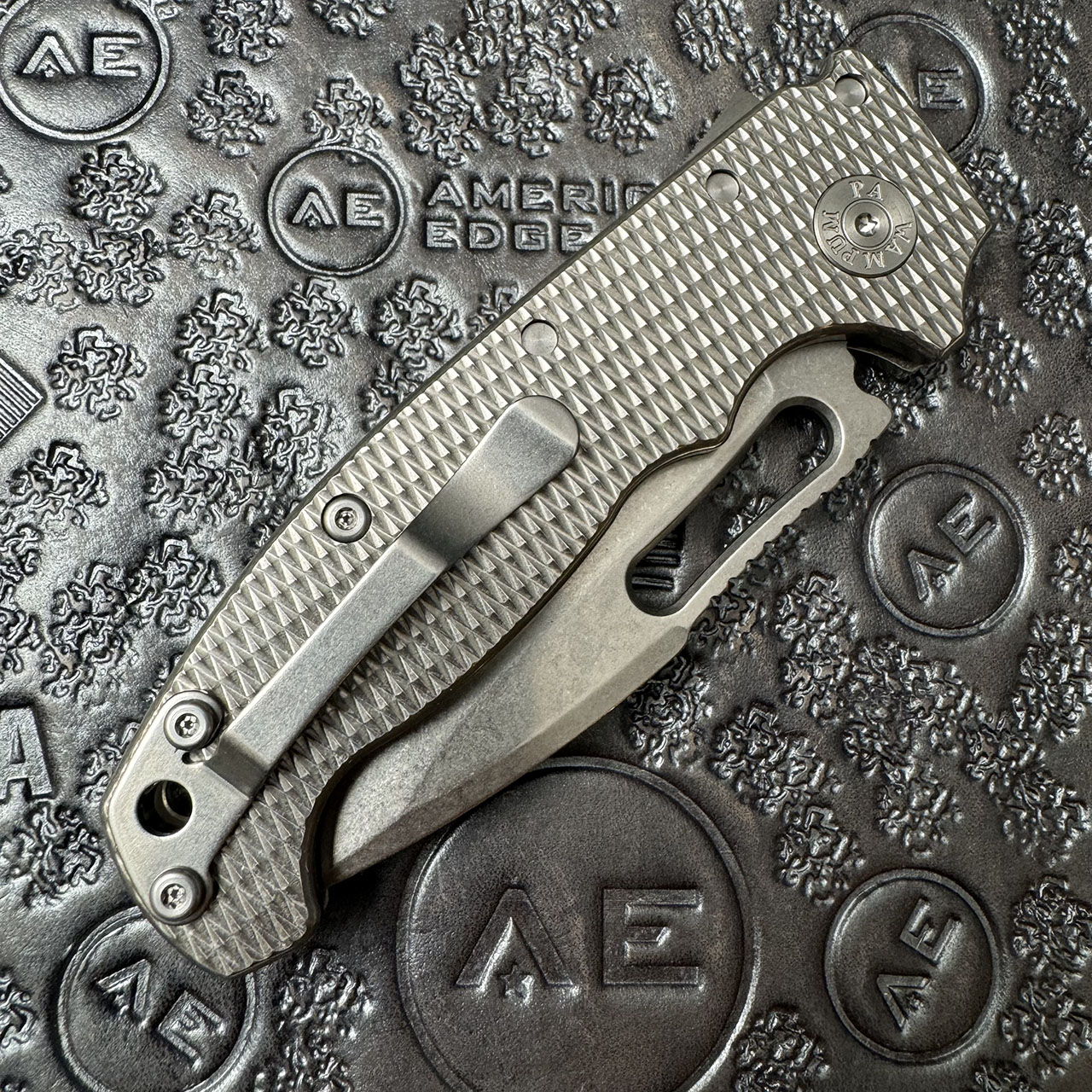 This American Edge exclusive model features textured titanium handle scales. Stonewash finished CPM-20CV stainless steel harpoon drop blade. Satin finished hardware and a stonewashed pocket clip. Brand new in box.