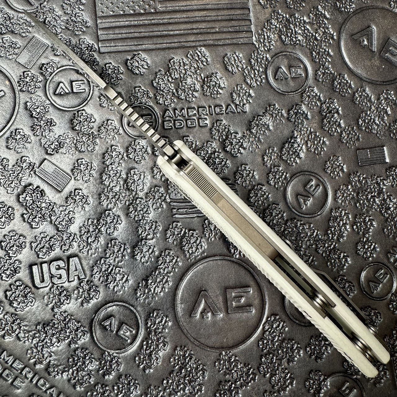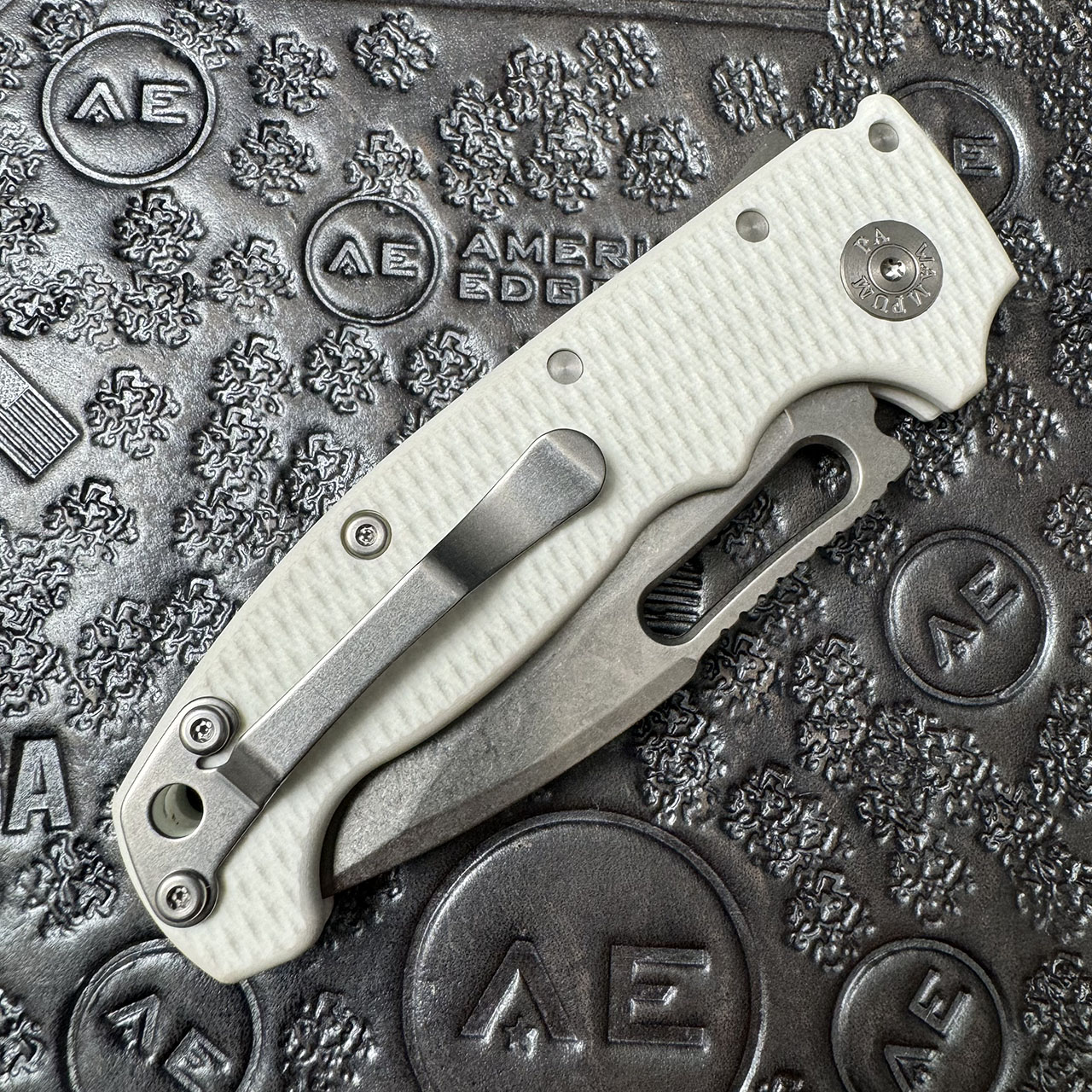 This American Edge exclusive model features white G10 handle scales. Stonewash finished CPM-20CV stainless steel harpoon drop blade. Satin finished hardware and a stonewashed pocket clip. Brand new in box.