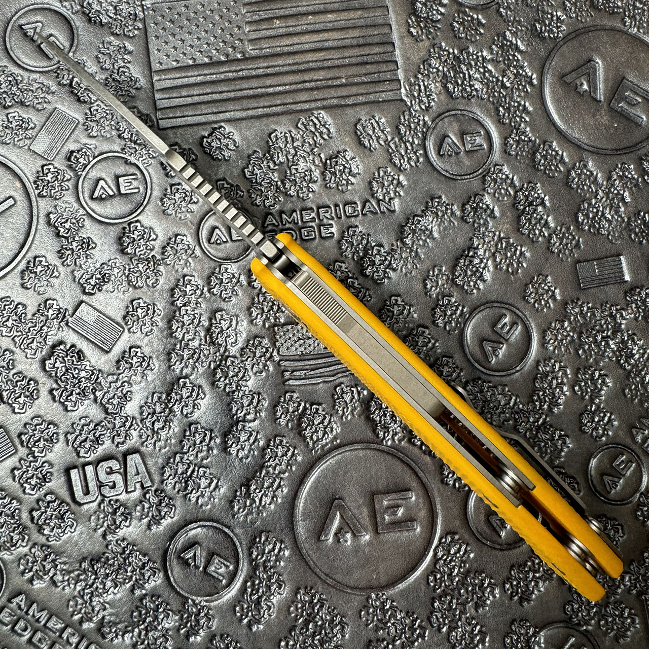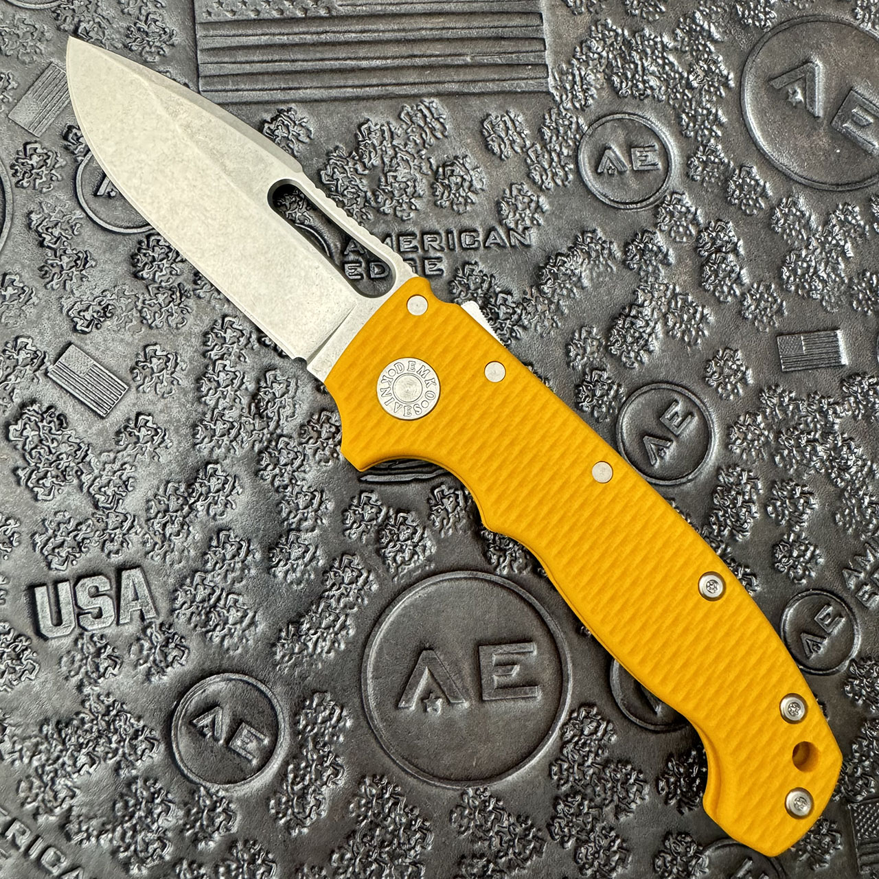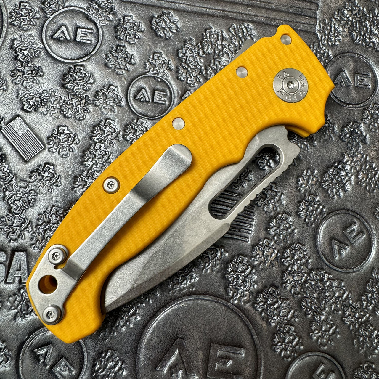 This American Edge exclusive model features yellow G10 handle scales. Stonewash finished CPM-20CV stainless steel harpoon drop blade. Satin finished hardware and a stonewashed pocket clip. Brand new in box.